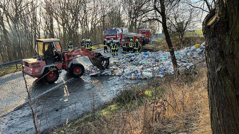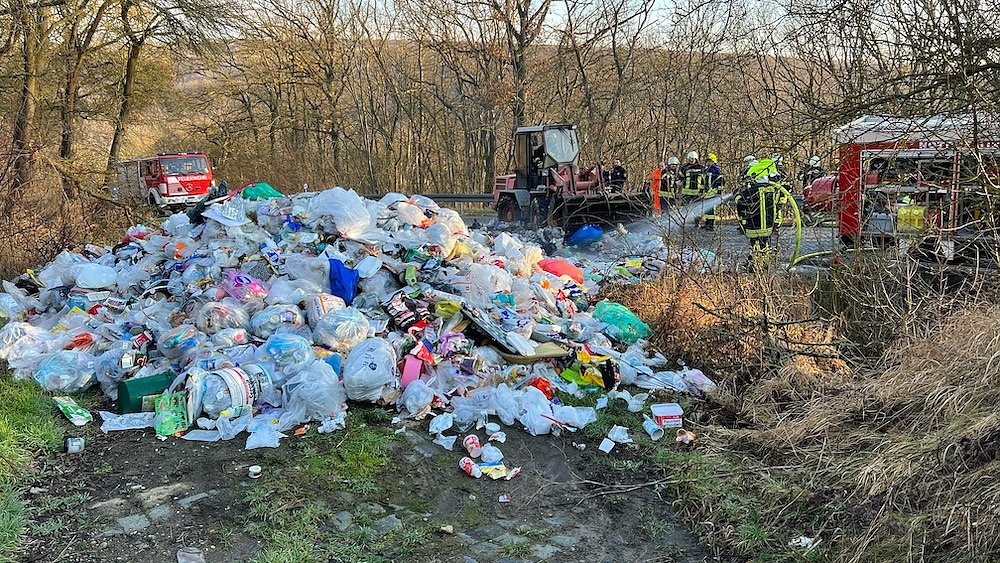 Mit einem Radlader vom Landwirtschaftsbetrieb Vonhof wurde der Müll auseinandergezogen und die Feuerwehr löschte den Brandherd. Nach zwei Stunden konnte die angrenzende Straße wieder freigegeben werden.