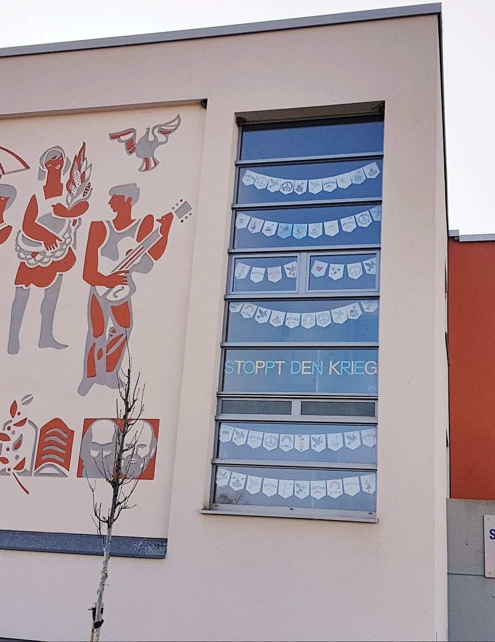 Stoppt den Krieg - die Grundschule Werther wurde in diesen Tagen einmal nicht der Jahreszeit sondern dem Zeitgeschehen entsprechend geschmückt (Foto: Marietta Schröter)