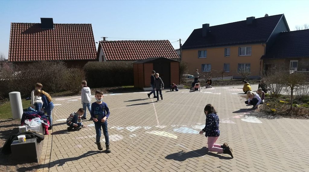 Somit entstand im Klassenrat der Klasse 2 die Idee, mit Kreide ein großes Peace-Zeichen auf den Schulhof zu malen und damit aktiv ein Zeichen für den Frieden zu setzen. Emily, Lilly und Adele brachten nicht nur den Vorschlag ein, sondern entwarfen jeweils auch ein eigenes Layout. Mittels einer demokratischen Klassenratabstimmung wurde ein Entwurf ausgewählt und gemeinsam mit der Hortkoordinatorin Frau Schädlich und ganz viel bunter Kreide umgesetzt. Außerdem wollten alle Klassen bunte Friedenswimpel gestalten. Egal ob Friedenstaube, Peace-Zeichen, Herzen oder Regenbögen – alles ist auf den über 100 Wimpeln zu finden, welche nun unsere Fenster schmücken.