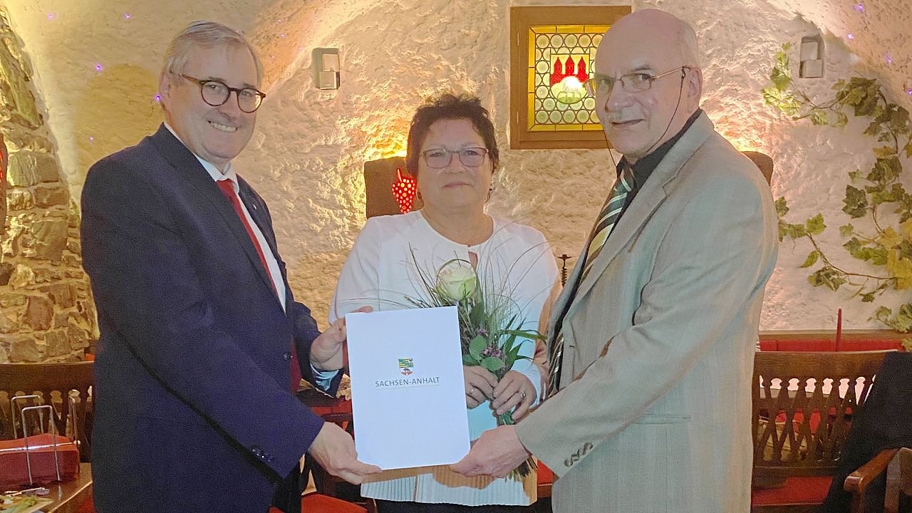 Wirtschaftsstaatssekretär Dr. Jürgen Ude hat heute das Gütesiegel Information zur Barrierefreiheit an das Hotel Restaurant Stolberger Hof und die Inhaberfamilie Ey in Stolberg im Südharz übergeben. (Foto: Presse MWL)