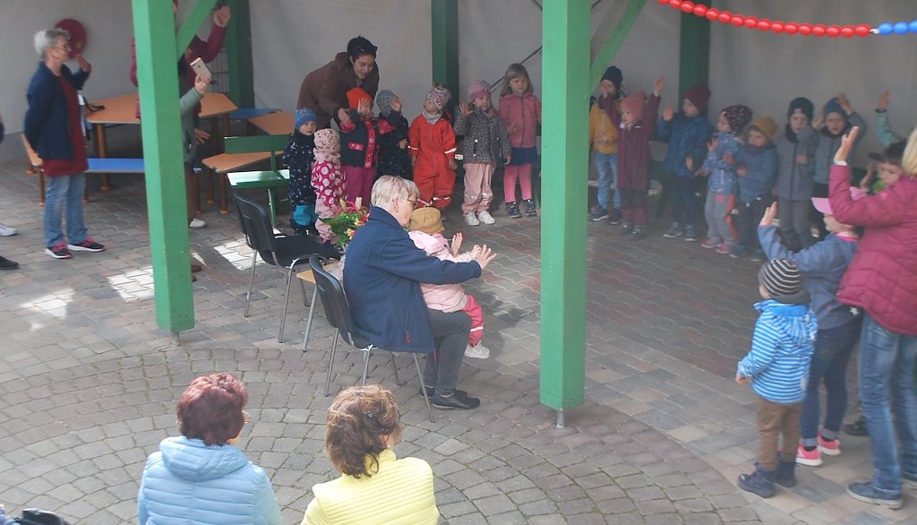 Die Kinder verabschiedeten sich von ihrer Kleinen Kerstin" musikalisch. Auch das Team hatte die eine oder andere Überraschung für sie parat. Der Elternbeirat und die Eltern der Waschbärengruppe und ehemalige Kolleginnen und Kinder verabschiedeten Kerstin in ihre wohlverdiente Ruhephase.