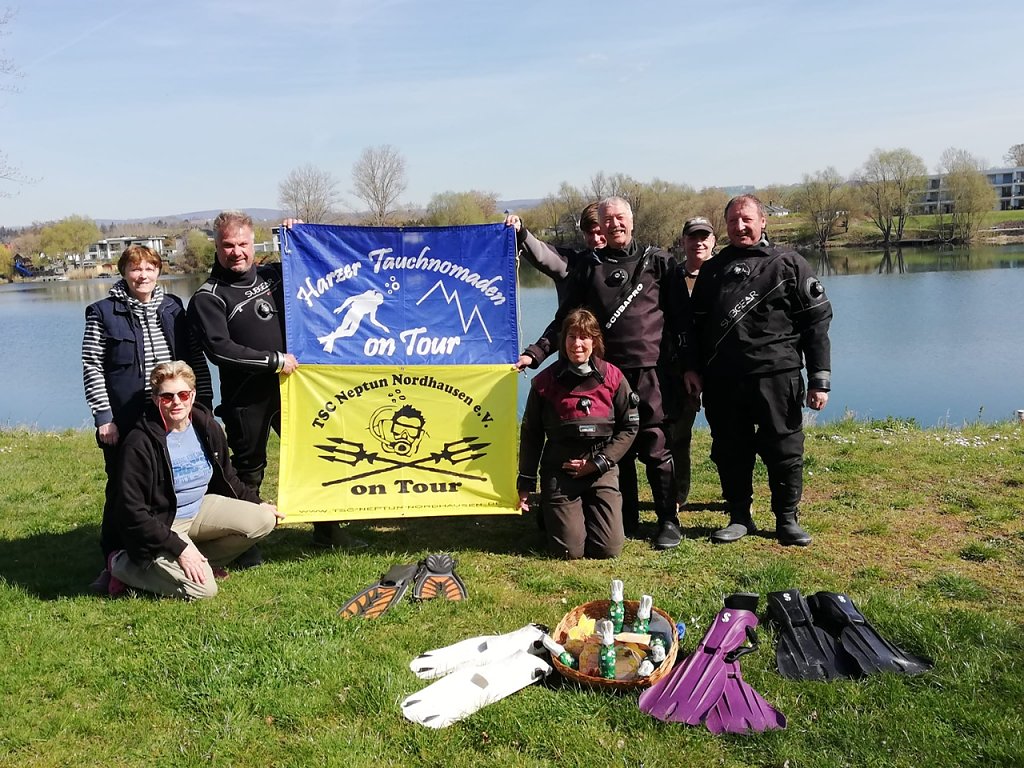 Da auch Mitglieder der "Harzer Tauchnomaden" zu gegen waren ergaben die Wimpel der beiden Gruppen einen Blau Gelben Gruß an die Ukraine und das Ostertauchen wurde so zum Tauchen für den Frieden.