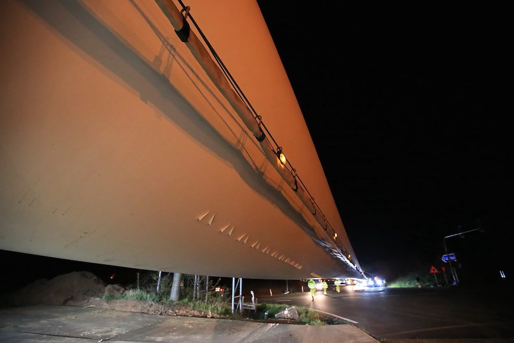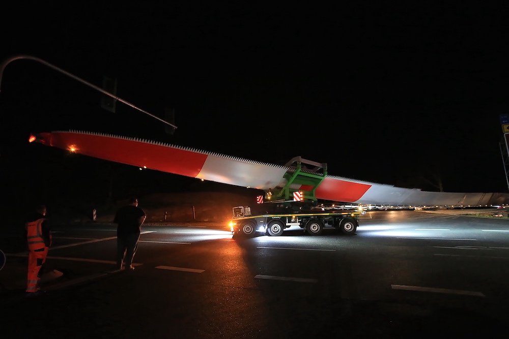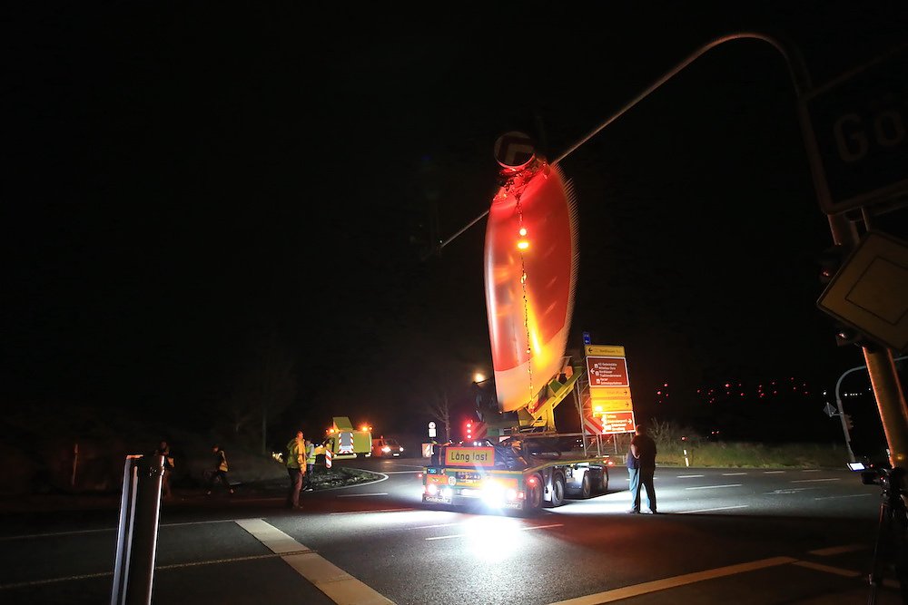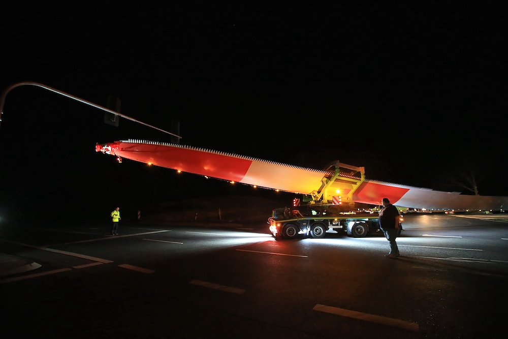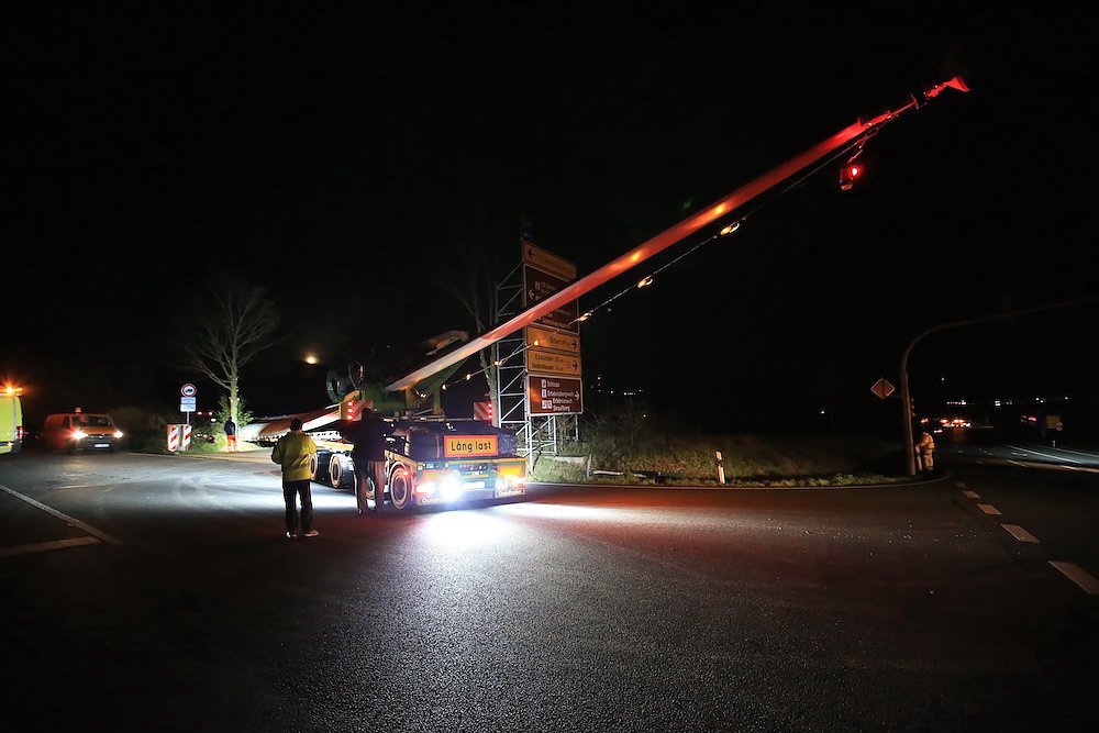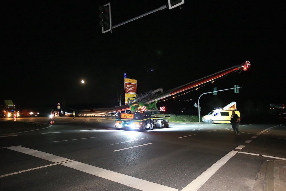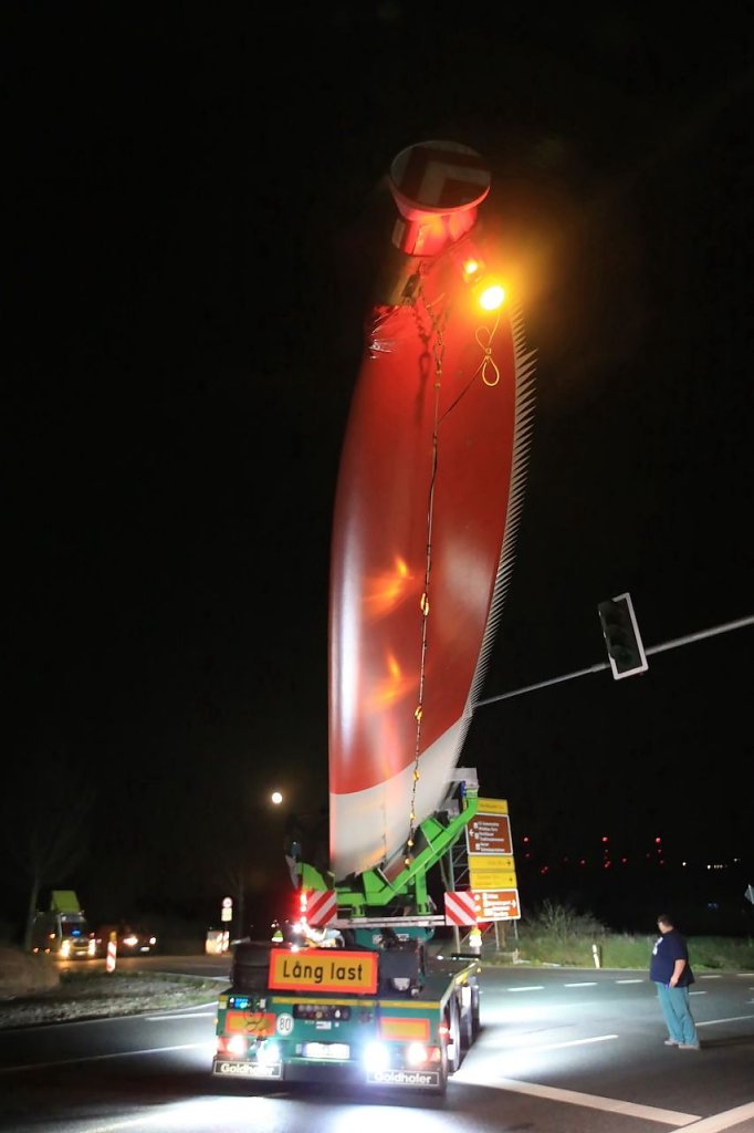 Es waren nur drei Teile, die für stundenlanges Rangieren nach diversen vorbereitenden Arbeiten an der Streckenführung sorgten; dafür aber eben drei sehr große. Stolze 92 Meter misst einer der drei Windmühlenflügel in der Länge, 4,5 Meter sind sie breit und bringen immerhin pro Stück 19 Tonnen auf die Waage. Letzte Nacht gegen 1 Uhr kamen sie von Leipzig auf der A 38 und sollten nach Kirchengel transportiert werden. Das fertige Windrad wird zu der dritthöchsten Kategorie in Deutschland zählen.