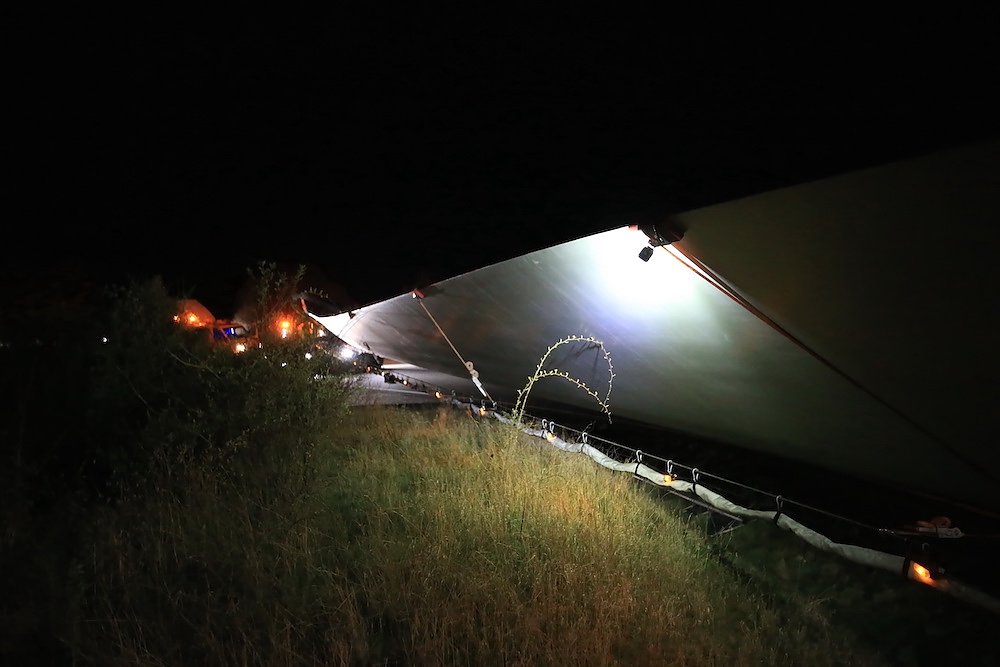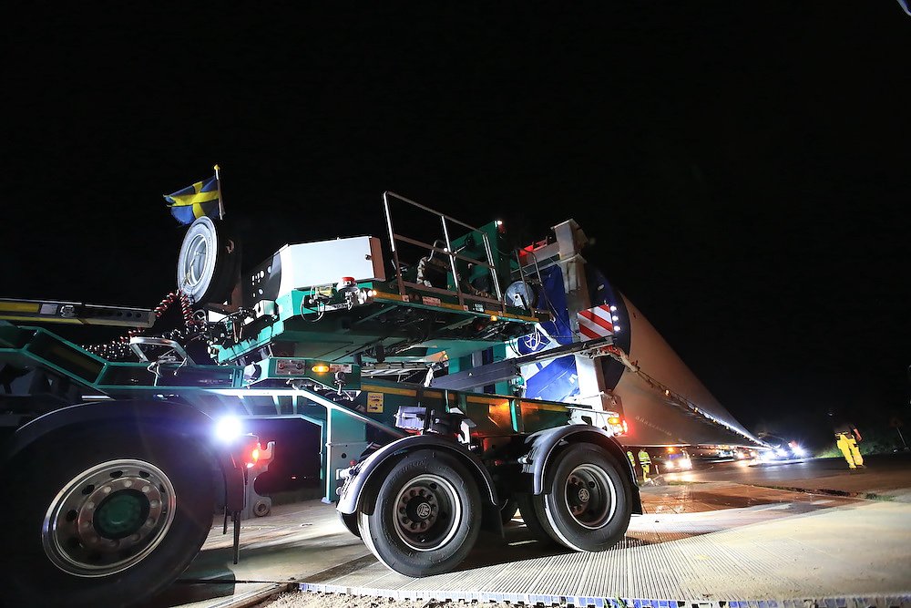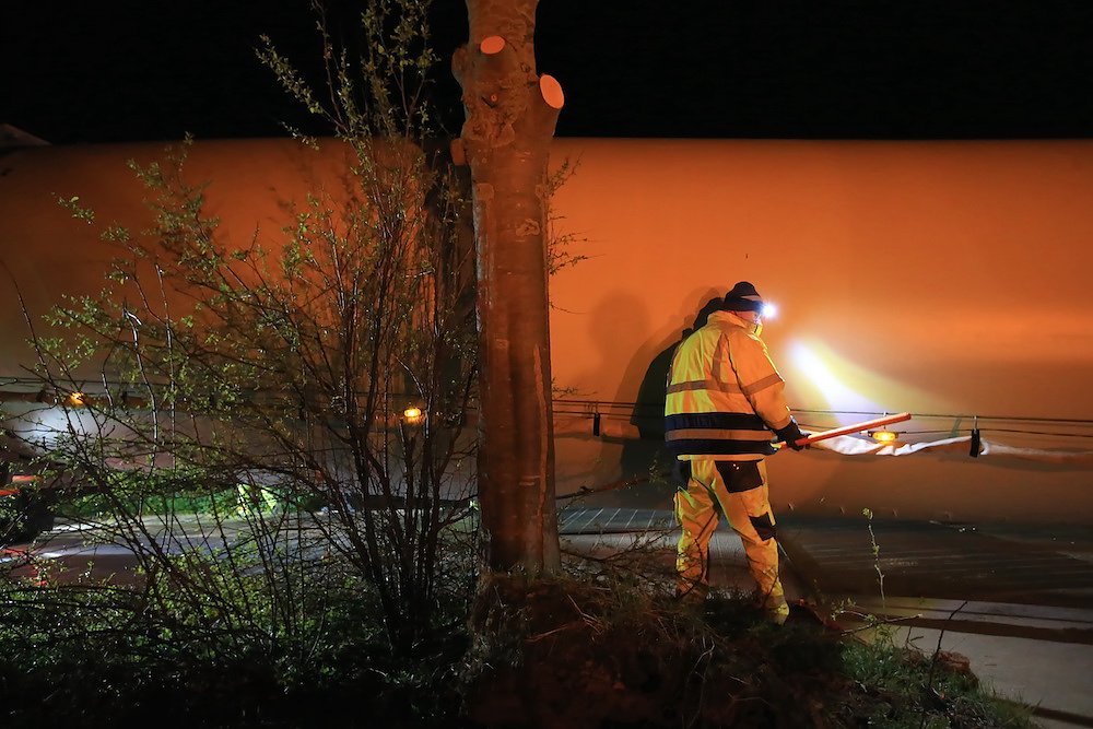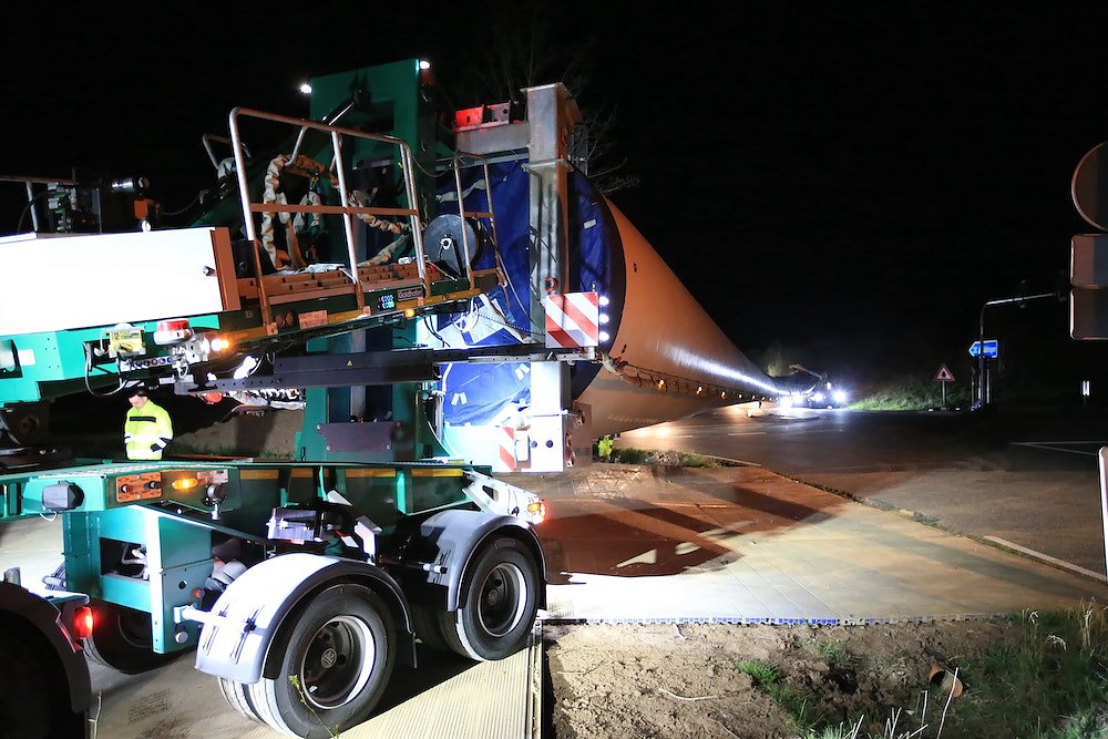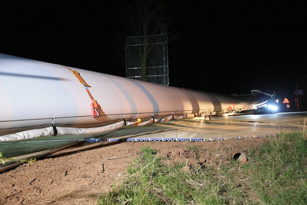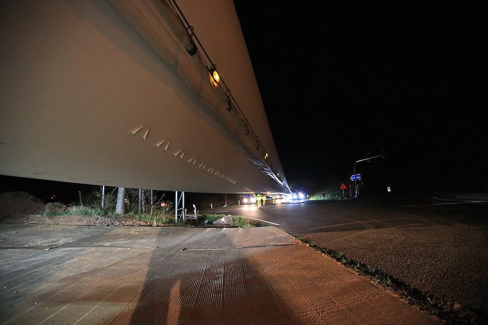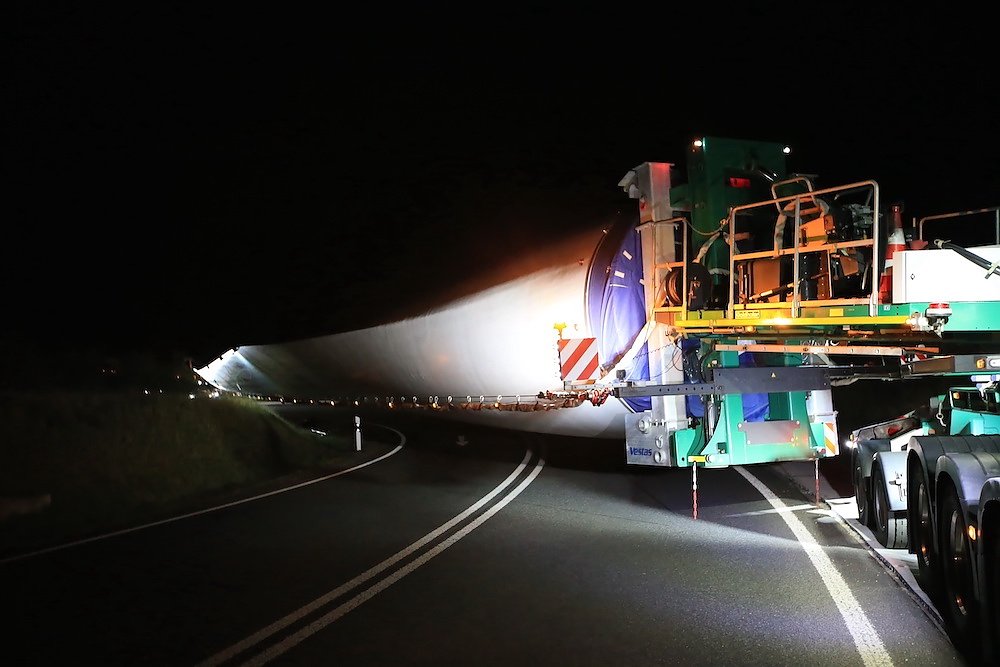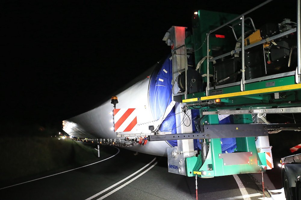 Es waren nur drei Teile, die für stundenlanges Rangieren nach diversen vorbereitenden Arbeiten an der Streckenführung sorgten; dafür aber eben drei sehr große. Stolze 92 Meter misst einer der drei Windmühlenflügel in der Länge, 4,5 Meter sind sie breit und bringen immerhin pro Stück 19 Tonnen auf die Waage. Letzte Nacht gegen 1 Uhr kamen sie von Leipzig auf der A 38 und sollten nach Kirchengel transportiert werden. Das fertige Windrad wird zu der dritthöchsten Kategorie in Deutschland zählen.