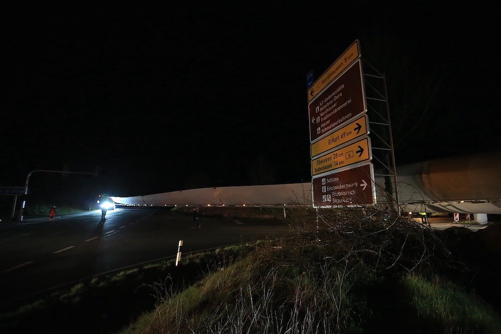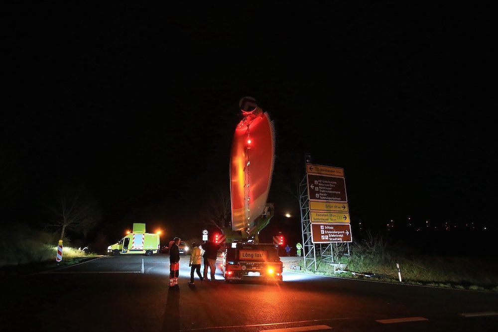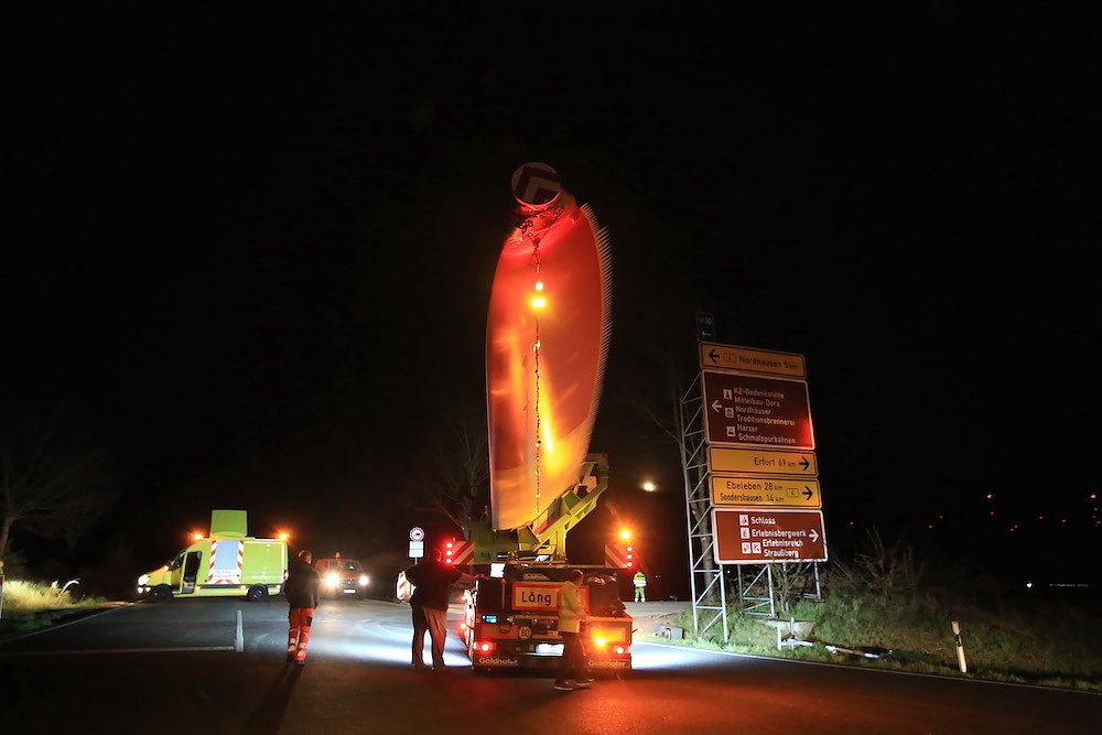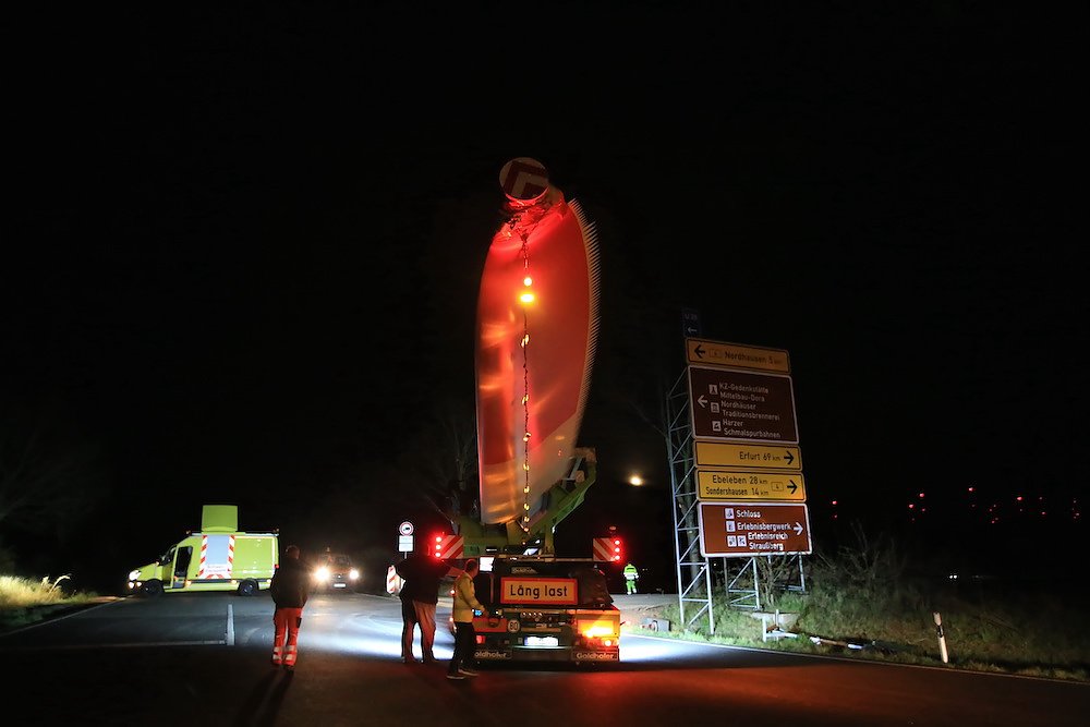 Ursprünglich stammen die Windradflügel aus Cuxhaven. Sie wurden von der Firma Vestas gebaut und nun von der bayrischen Firma SCHWANDNER über zwei Nächte nach Nordhausen transportiert. Die Zwölf gelben Autos (Verwaltungshelfer, Polizeiersatz ) wurden von der Firma ZURECK LOGISTIK gestellt und sicherten den Einsatz vor und nach den Windrädern ab.