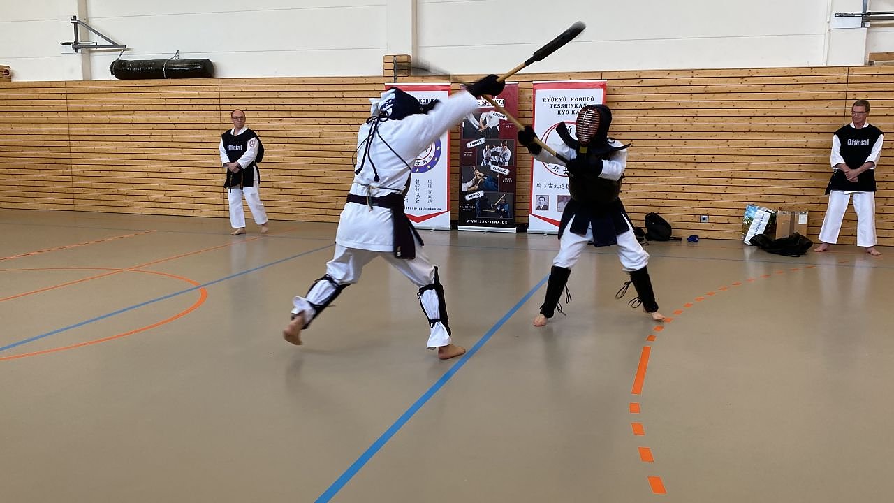 Die Meisterschaften selbst waren dazu diesmal äußerst spannend. Bei den Kata-Ausscheidungen (Formenlaufen) der Schülergrade konnte Zinecker sich mit einem hauchdünnen Vorsprung von 0,001 Punkten die Silbermedaille vor Freybergs Bronze sichern. Gold errang Stephan Brandenburg aus Leipzig. Und auch beim Bô-Shiai, dem Freikampf mit dem Langstock, setzte sich Zinecker gegen Freiberg durch und erkämpfte sich mit dem goldenen ersten Platz den Titel des Deutschen Meisters, während für den anderen immerhin Silber und der Titel des Deutschen Vizemeisters blieb.