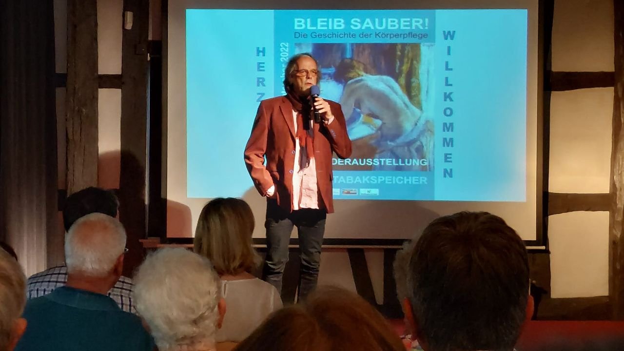 Eröffnet wurde die Vernissage mit dem bekannten Klassiker "It’s Raining Men" von den Weather Girls. Ob es jemals wirklich Männer geregnet haben sollte, ist garantiert nicht verbürgt. Verbürgt dagegen waren die Anekdoten rund um das Thema der Reinlichkeit, die Rennebach dem Publikum zur Eröffnung ans Herz legte.