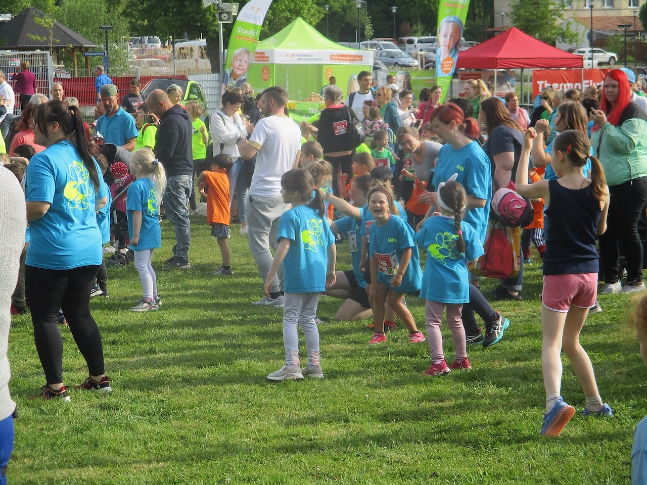 Unterdessen gab es auf der großen Wiese neben dem Freibad allerlei Stände, Vorführungen und buntes Treiben. Alle Starterinnen und Starter wurden von der Tanzschule Miles Shane zur Bewegung animiert, so dass sie gut vorbereitet auf die Strecke gehen konnten. Die zahlreichen Betreuer und Eltern der Kinder hatten alle Hände voll zu tun, für viele junge Lauffreunde, war es das erste große Event in der Form. Die Fröhlichkeit und die gute Laune aller Beteiligten schien förmlich greifbar.