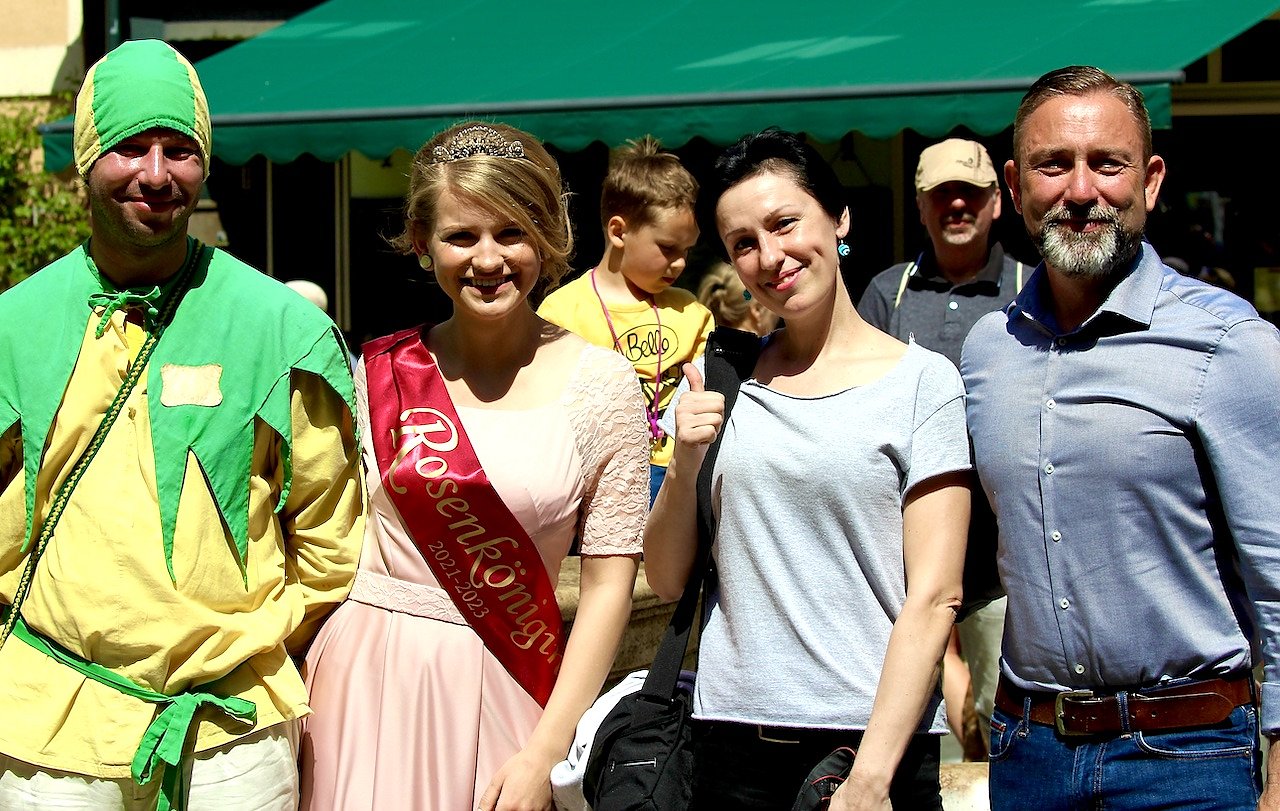 Zufriedene Gesichter bei Bürgermeister Reinz (re.), Rosenkönigin und den Gästeführern (Foto: Eva Maria Wiegand)