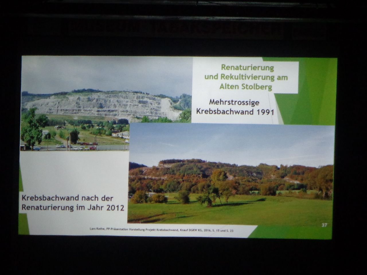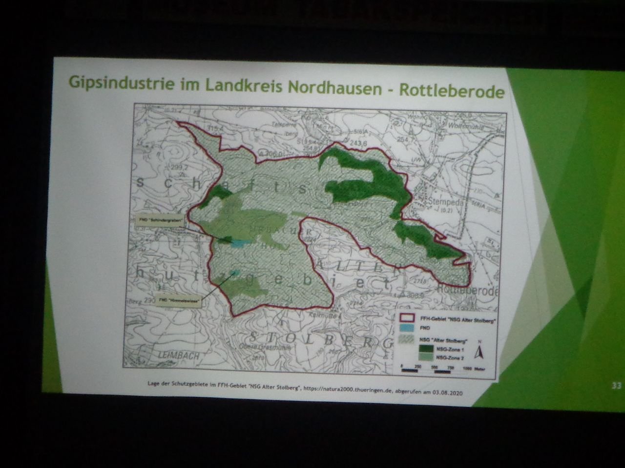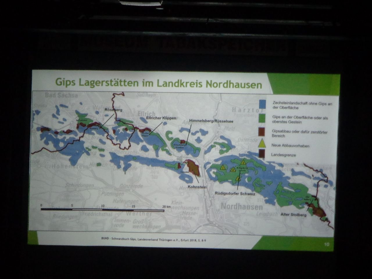 Darüber hinaus schilderte Dr. Reinhardt die Vorgehensweise der Rekultivierung und Renaturierung von ehemaligen Gipsabbaugebieten, zumal durch den Abbau von Gips die in hunderttausenden von Jahren geformte Landschaft großen Schaden genommen hat. Auch wenn die Interessenlage zwischen Gipsindustrie und Naturschützern sich unterschiedlich darstellt, sind beide Seiten angehalten, weiterhin nach einem ausgewogenen Kompromiss zu suchen, den es in einigen Bereichen ja auch schon gibt.