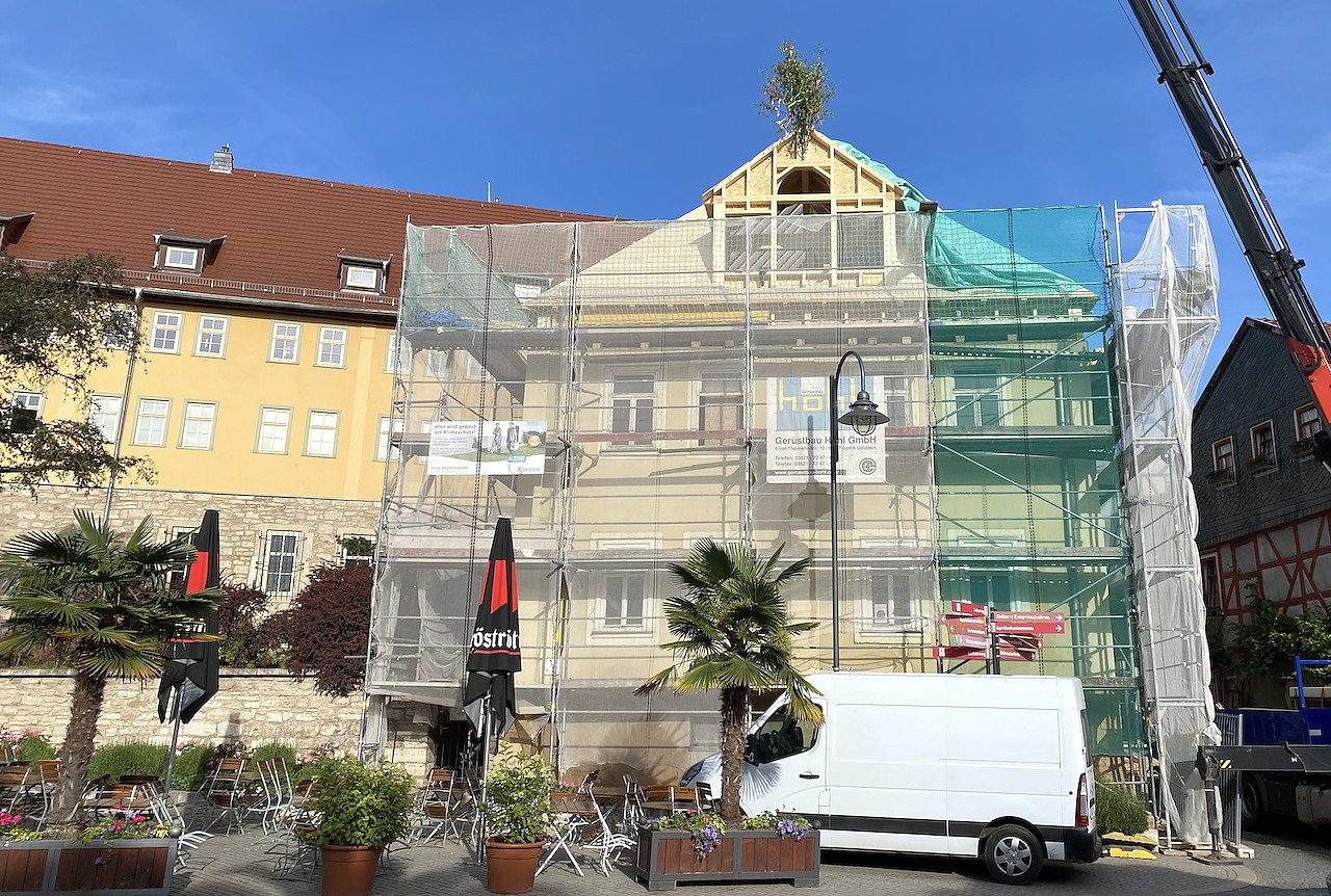 Das Gebäude soll eine Erweiterung der Pension Zur Weintraube werden, in der nach dem gründlichen Umbau vier barrierefreie Ferienwohnungen entstehen. Die Firma Zimmerei Volker Ehrlich übernahm die Dacharbeiten und konnte gestern die Richtkrone platzieren.