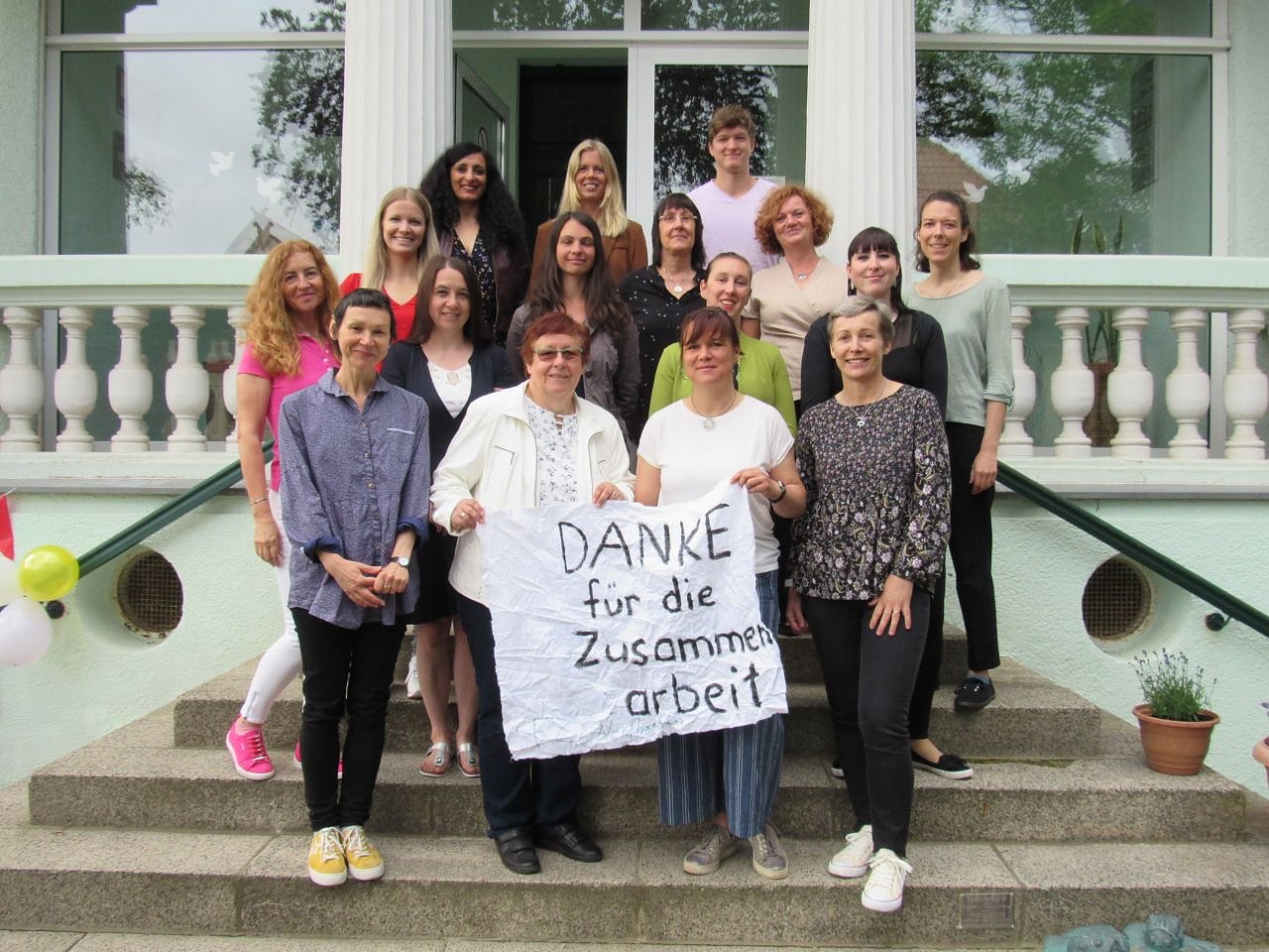 Der Dank des kompletten Familienzentrum-Teams geht an alle Kooperationspartner und Unterstützer. Das Plakat ist etwas zerknittert, weil es für eine Videobotschaft bereits auf den Berg Ararat (5137 m) in die Türkei mitgereist ist. (Foto: Familienzentrum)
