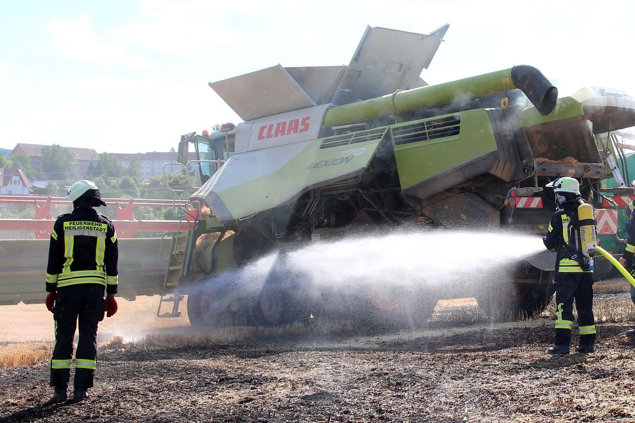 Gleich dreimal rückte die Feuerwehr Heiligenstadt am Montag zu Bränden auf Getreidefeldern aus. Um 16:40 Uhr eilten die Einsatzkräfte zu einem brennenden Mähdrescher auf einem Feld am Heiligenstädter Ostzubringer.