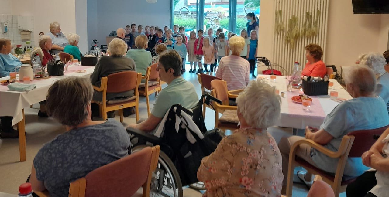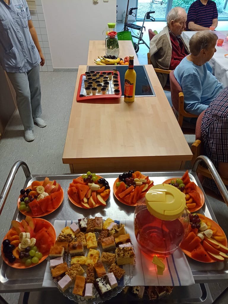 Währenddessen konnten im Saal des Seniorenzentrums interessierte Besucher bei Kaffee und selbstgebackenem Kuchen oder einer Rostbratwurst Fragen zur Tagespflege stellen.