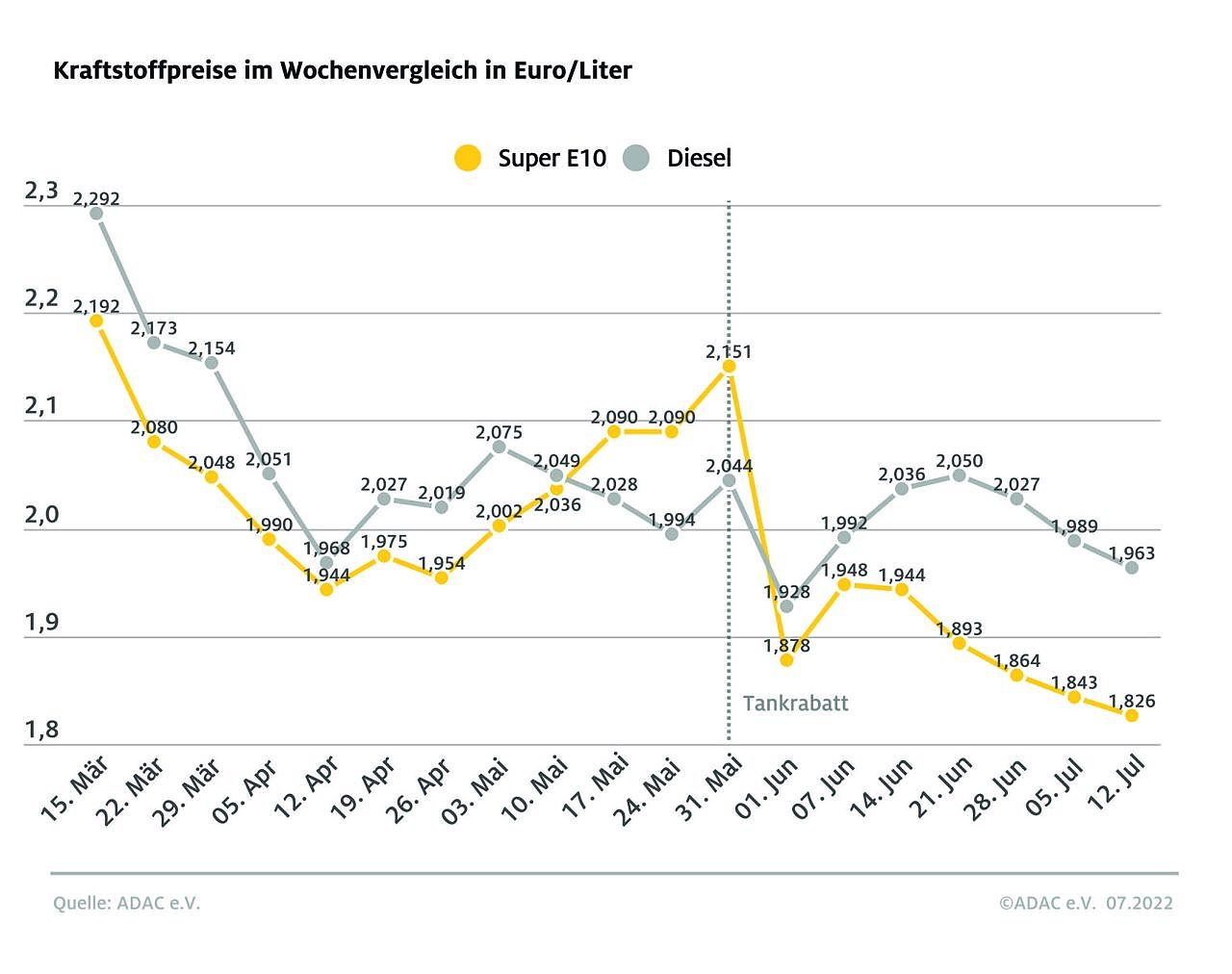 Die Kraftstoffpreise an den deutschen Tankstellen sind im Vergleich zur Vorwoche erneut etwas gesunken. Wie die heutige ADAC Auswertung der Kraftstoffpreise ergibt, müssen die Autofahrer für einen Liter Super E10 derzeit im bundesweiten Mittel 1,826 Euro bezahlen, das ist ein Rückgang von 1,7 Cent...