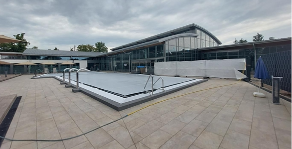 Nach dem Rückbau des alten Außenbeckens entstand an derselben Stelle ein komplett neues, größeres Becken. Im Zuge des Neubaus wurden Maßnahmen getroffen, um das Becken energetisch zu betreiben. Der Wärmeverlust wird durch eine elektronisch betriebene Abdeckung minimiert und dient gleichzeitig als Schutz vor Verunreinigung durch Laub. Der Bereich um das Becken wurde neu gefliest und ist teilweise durch eine Bodenheizung ausgestattet, diese ermöglicht die rutschfreie Nutzung des Außenbereichs in der kalten Jahreszeit.