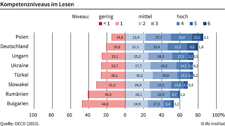 Das Kompetenzniveau ukrainischer Schulkinder liegt zwar unter dem deutscher Kinder, aber deutlich über dem Niveau von Kindern aus EU-Ländern wie Rumänien und Bulgarien, aus denen bereits zahlreiche Kinder erfolgreich in das deutsche Schulsystem integriert wurden, sagt Lukas Mergele, Bildungsexperte am ifo Institut.
