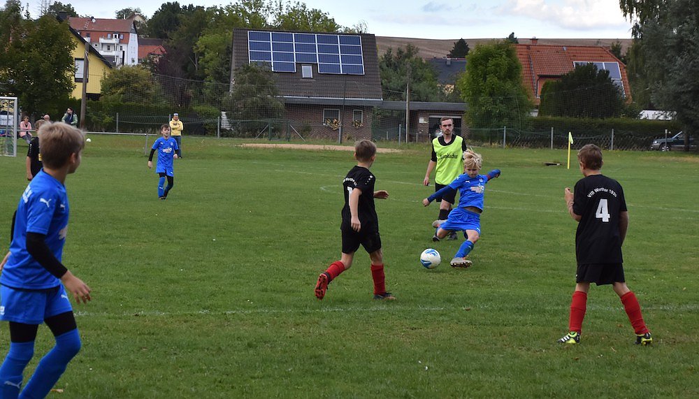 Die Wacker-Kids haben ihr letztes Punktspiel souverän gewonnen und wollten nun auch in Werther mit Bravour bestehen. Finn Pitulle brachte die Nordhäuser bereits in der 2. Minute mit einem 13 m-Schuss in den linken oberen Winkel mit 0:1 in Führung. Es entwickelte sich eine spielerische Überlegenheit der Wackeren. Werther setzte jedoch hin und wieder gefährliche Nadelstiche durch den agilen Niklas Weitze. Mit einem Steilpass aus der eigenen Abwehr wurde Niklas in der 10. Minute auf die Reise geschickt. Er nutzte seine Chance, überlief die Wacker-Abwehr und setzte den Ball am herauslaufenden Keeper vorbei zum 1:1 Gleichstand ins Netz. Wacker erhöhte nun den Druck und konnte bis zur Pause durch Nils Goldhorn (2 Treffer) und Finn Pitulle auf 1: 4 davonziehen.