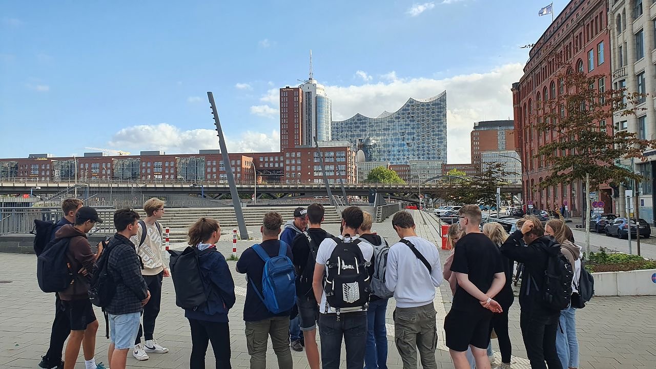 Nachdem die Schülerinnen und Schüler die beeindruckenden Dimensionen des Containerhafens bestaunt hatten, ging es weiter durch die Speicherstadt, wo bereits einige Attraktionen der nächsten Tage von außen in Augenschein genommen werden konnten.