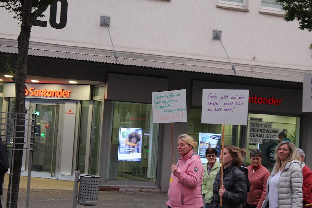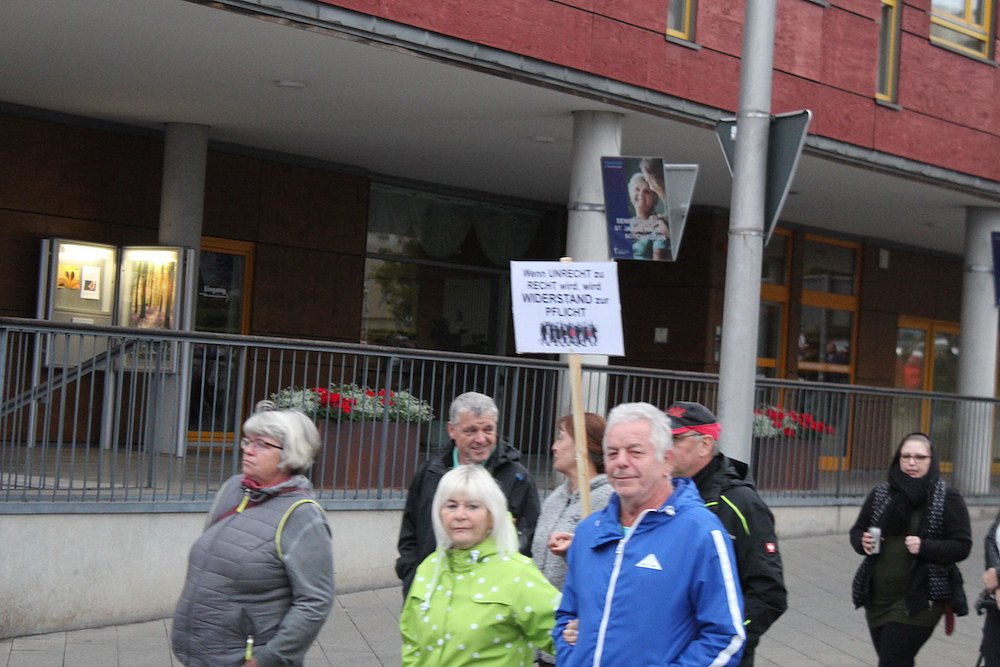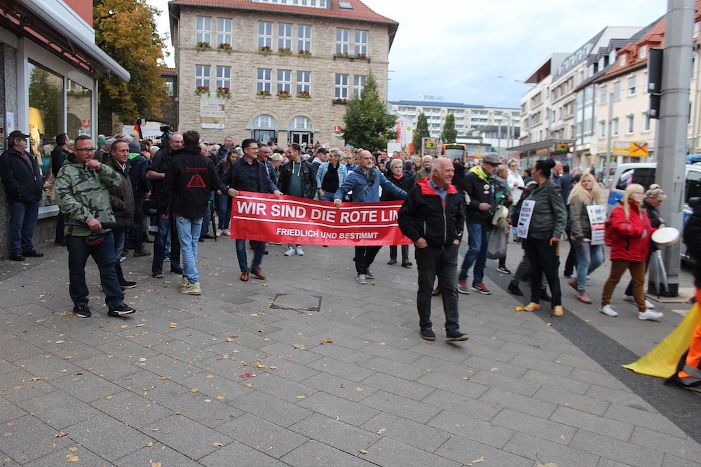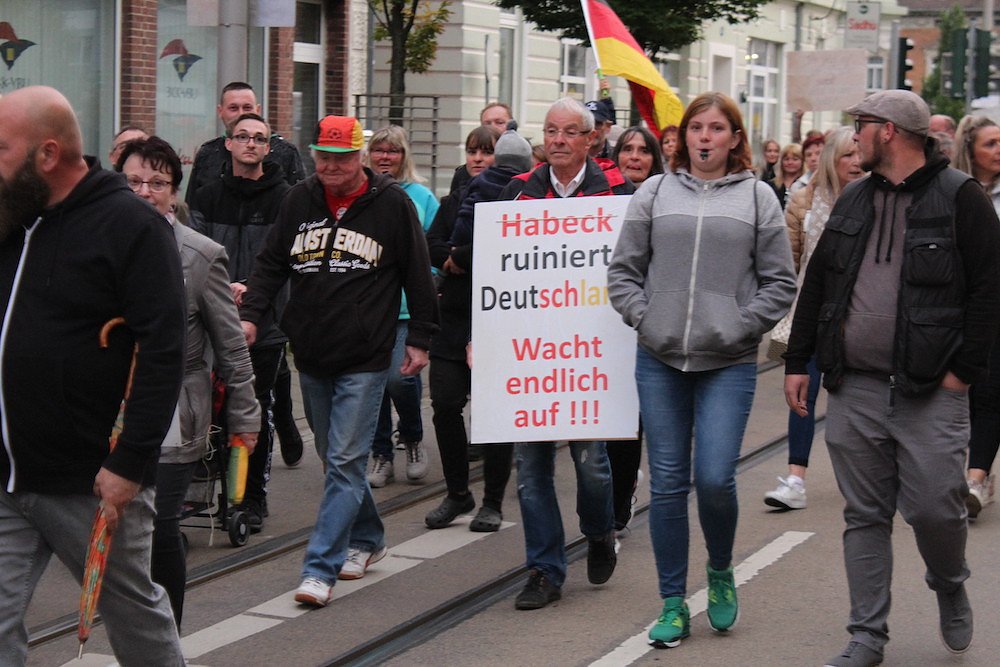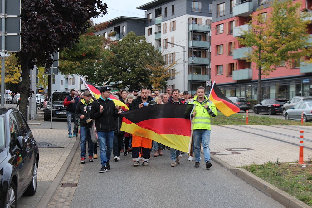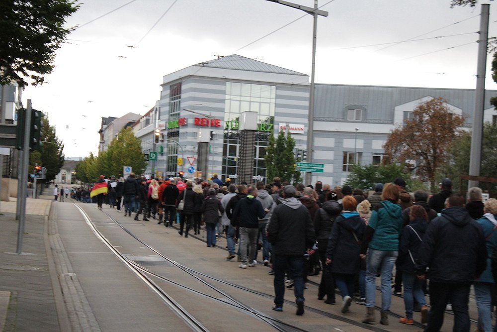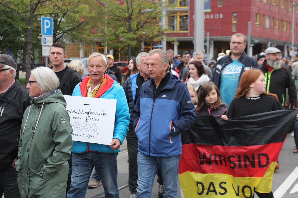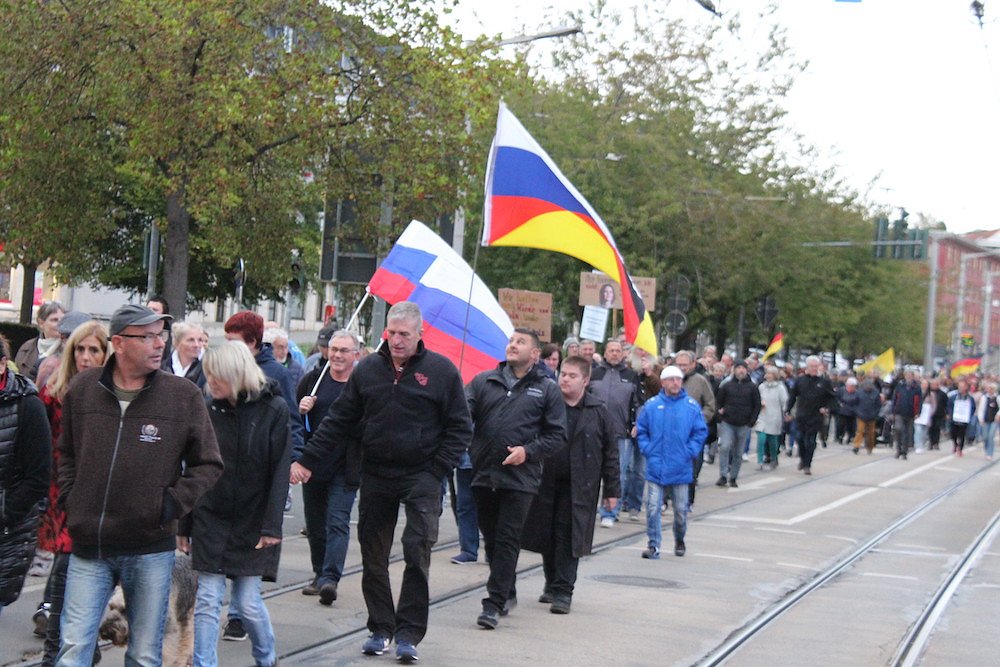Nicht einige vereinzelte Transparente wie noch vor einigen Wochen, sondern massenhaft Schilder und Umhängeplakate wurden im Demonstrationszug mitgeführt, viele Deutschlandfahnen waren zu sehen und auch einige in den Trikolore-Farben der Russischen Föderation. Von den weit über 1.000 Teilnehmern ging auch niemand mehr auf dem Fußweg; inzwischen ist der Protest direkt auf der Straße (Fahrbahn) angekommen und er wird immer lauter. Trommeln, Sirenen, Trillerpfeifen und immer wieder aufbrandende Sprechchöre wie Bürger lasst das Glotzen sein, reiht euch auf der Straße ein bestimmten die Szenerie akustisch. Die ersten Flyer mit politischen Forderungen machten die Runde, immer wieder wurde Widerstand aus den Reihen der Protestierer skandiert. Wir sind eine Bürgerbewegung, hieß es auf die Frage, ob es Spaziergang oder Demonstration sei.