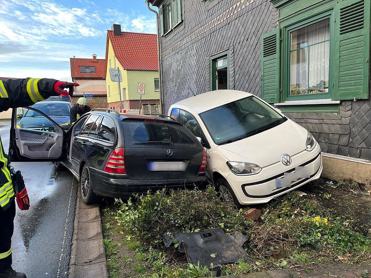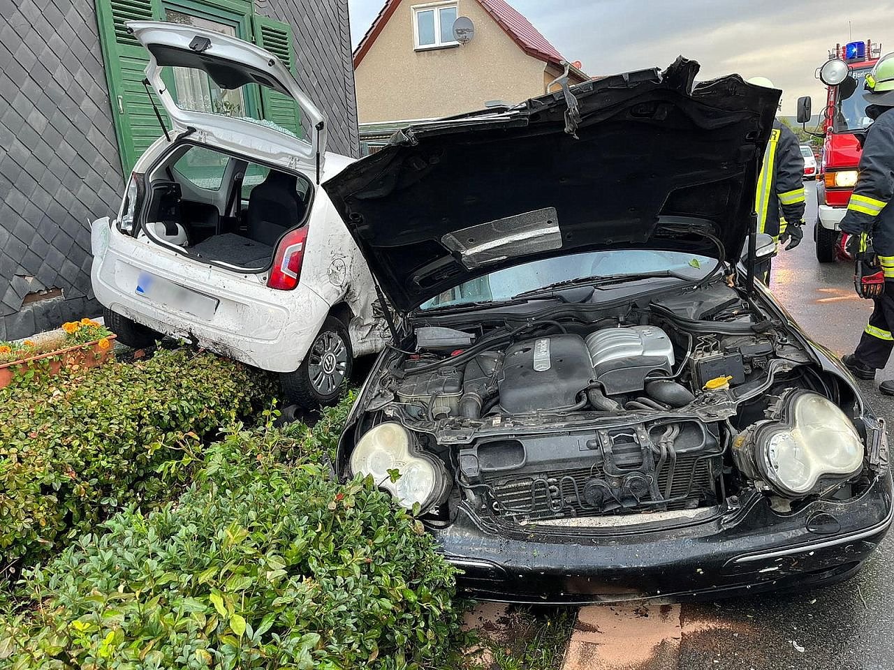 Der Mercedes kam nach rechts von der Fahrbahn ab, fuhr über den Bordstein und durch gut drei Meter Hecke. Dann begegnete er in einer Grundstückseinfahrt einem dort geparkten VW Up. Der Mercedes schlug in die Beifahrerseite des VW ein und riss diesen mit sich, wodurch der Kleinwagen in ein Hoftor und gegen eine Hauseingangstür geschleudert wurde.