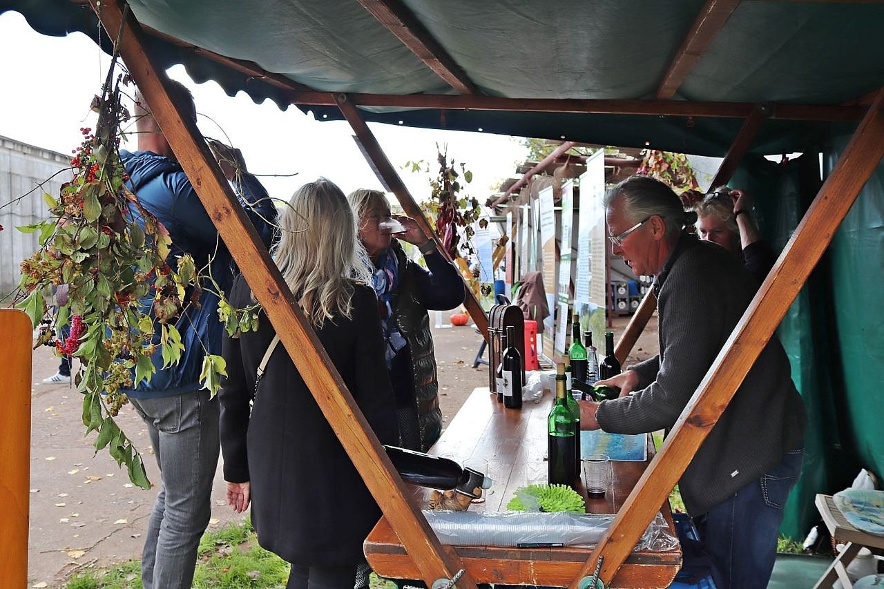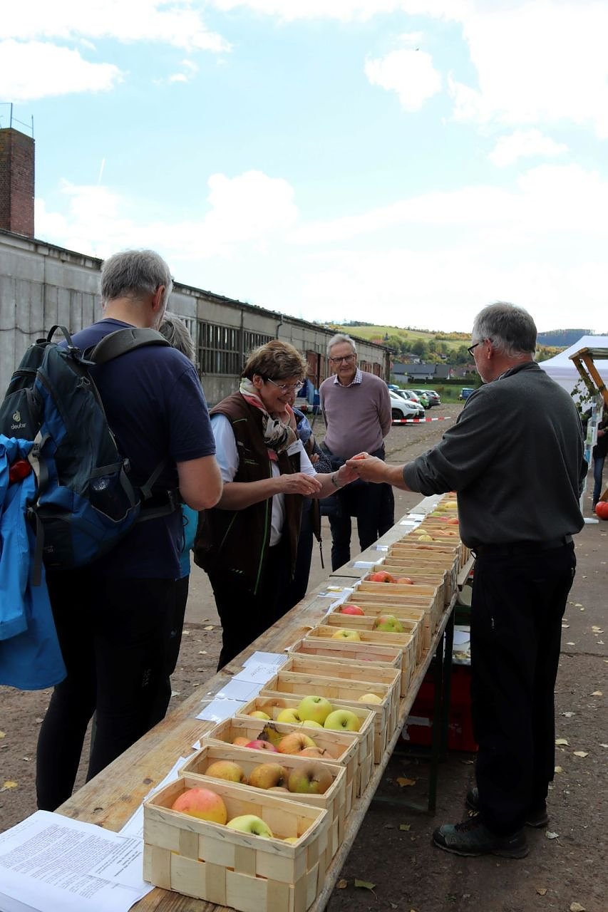Viele Besucher aus der Region nutzten die Apfelpresse und kamen vollbeladen mit Äpfeln, Quitten und Birnen vorbei, um aus ihrem Obst eigenen Saft pressen zu lassen. Wer keine eigenen Äpfel hatte, konnte sich dennoch Apfelsaft von den Streuobstwiesen der Region mit nach Hausen nehmen. Dass ein Apfel nicht gleich ein Apfel ist, zeigte ein Pomologe mit seinen zahlreichen Apfelsorten, die sich zum Teil nur in Feinheiten unterscheiden.