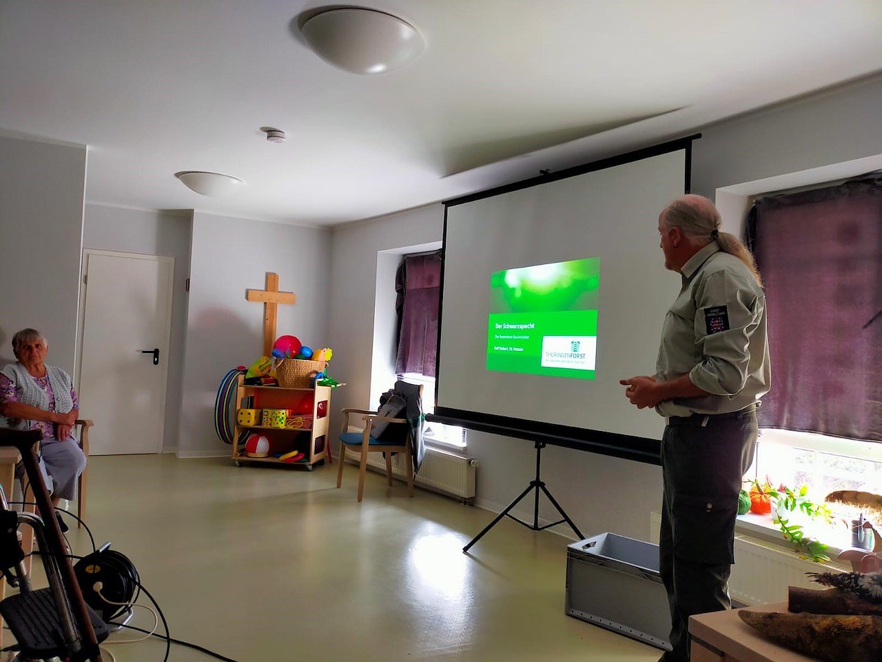 Um diese zu erhalten und den Bezug zur unserer Region immer wieder herzustellen, lud die Tagespflege Anfang September den Förster Ralf Hubert ein. Er brachte interessante Exponate von ausgestopften Tieren unserer Region mit, um eine Vorstellung von der Größe einzelner Tiere zu erhalten, die man sonst eher selten sieht und schon gar nicht aus der Nähe. Er erklärte anhand des Spechts die Vielfalt des Waldes und sein Ökosystem. Es war sehr interessant zu erfahren, dass zum Beispiel
