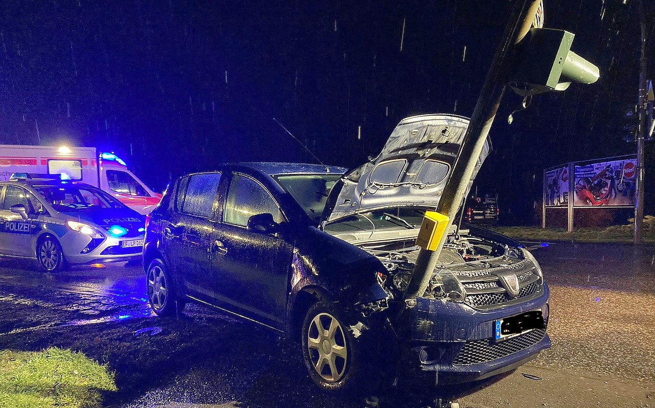 Die 56-jährige Fahrerin eines Dacias fuhr, von der Straße An der Helme kommend, auf die B4 auf. Aus bisher ungeklärter Ursache übersah sie dabei eine am rechten Straßenrand stehende Fußgängerampel und kollidierte damit.
