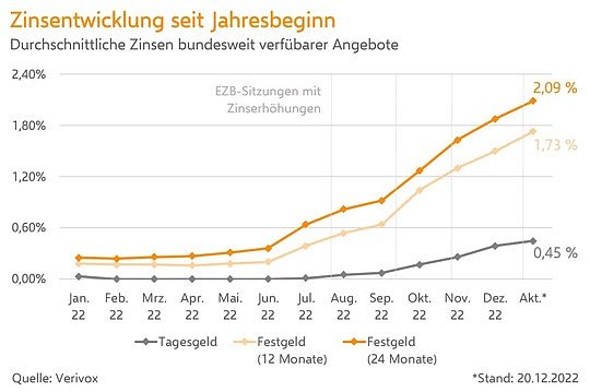Der Markt hatte den erwarteten Zinsschritt der EZB schon im Vorfeld ein Stück weit eingepreist, berichtet Oliver Maier, Geschäftsführer der Verivox Finanzvergleich GmbH. Bereits seit Juni steigen die Festgeldzinsen auf breiter Front. Die vier Leitzinserhöhungen in der zweiten Jahreshälfte haben die Rallye dann nochmal spürbar angeheizt.