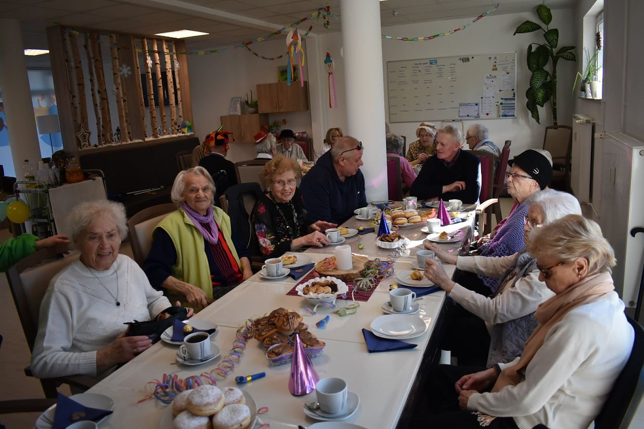 Dass unter den Angehörigen auch Enkelkinder der Tagespflegegäste waren, machte den Tag nochmal zu etwas ganz Besonderem. Selbstverständlich wurde eigens dafür wieder Kuchen von den Tagespflegegästen selbst gebacken. Und wie es sich für eine ordentliche Faschingsfeier gehört, gab es auch Berliner, Muffins, Knabbergebäck, Sekt und alkoholfreie Getränke. Ganz nach dem Motto: zum Feiern und Spaß haben ist man nie zu alt!