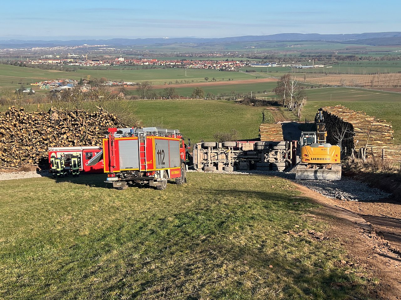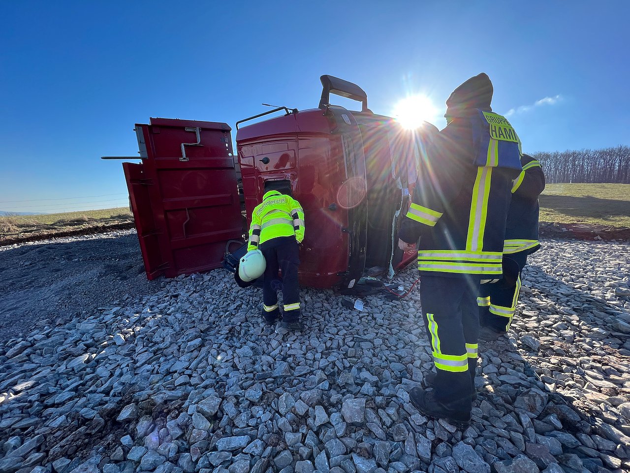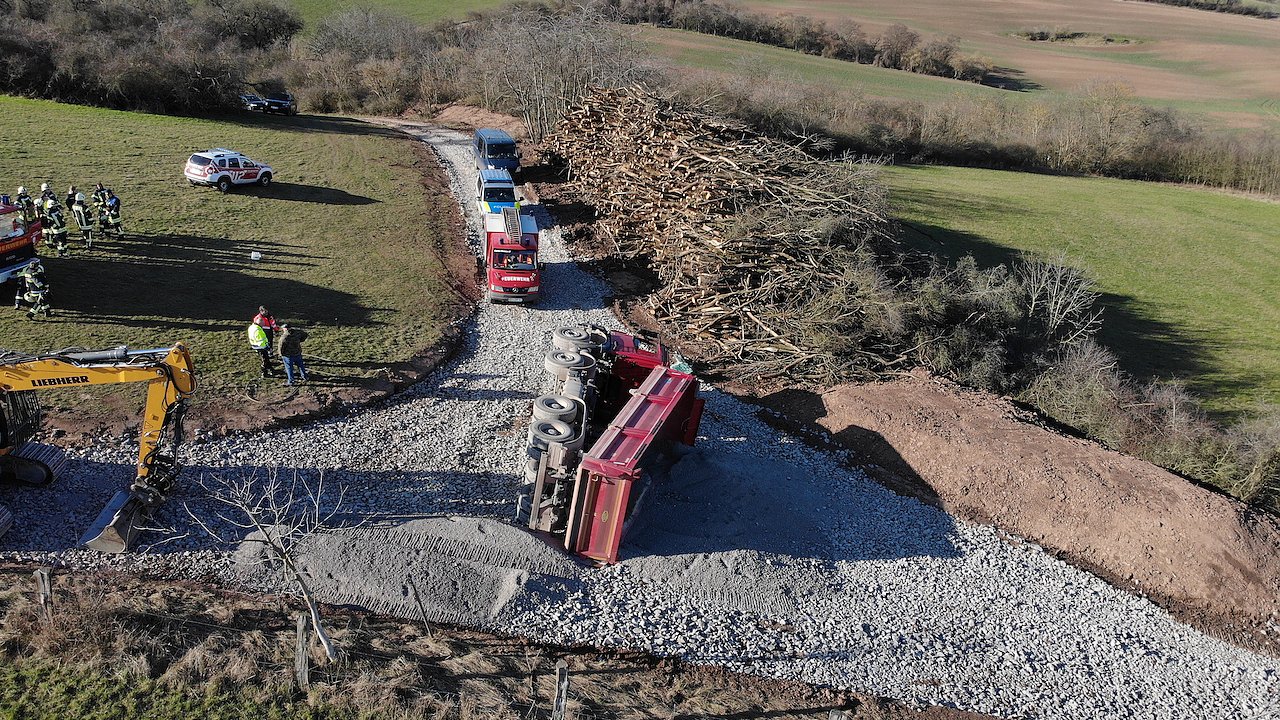 Der Fahrer wurde in seinem Fahrzeug eingeschlossen und musste durch die Feuerwehr befreit werden. Der 49-Jährige wurde bei dem Unfall schwer verletzt. Neben der Feuerwehr, Rettungsdienst und Polizei war auch der Rettungshubschrauber im Einsatz. Das Amt für Arbeitsschutz ermittelt, ebenso war das Umweltamt vor Ort.