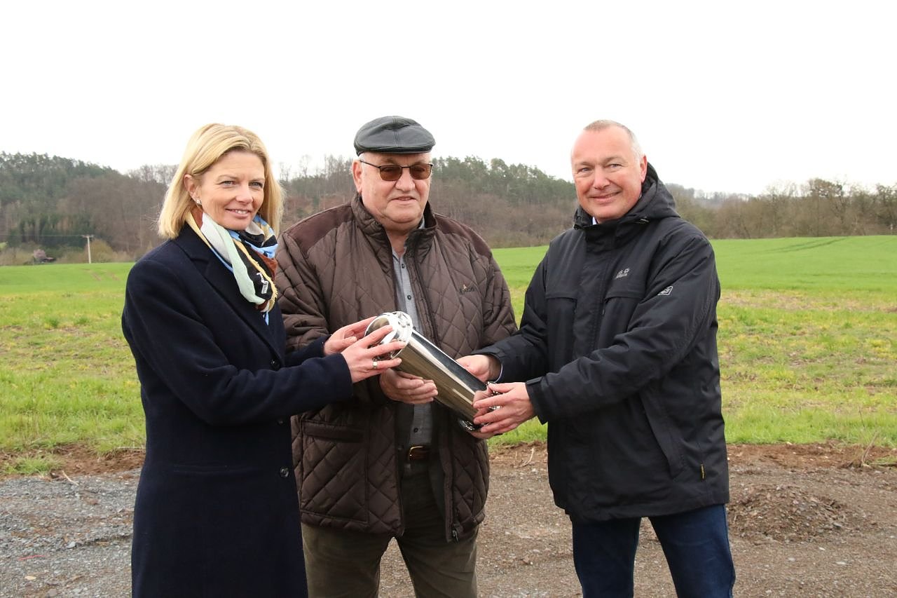 v.l.: Bürgermeisterin Alexandra Rieger, der Verbandsvorsitzende Egon Primas und der Beigeordnete Dirk Schimm versenkte eine Zeitkapsel am Standort (Foto: agl)