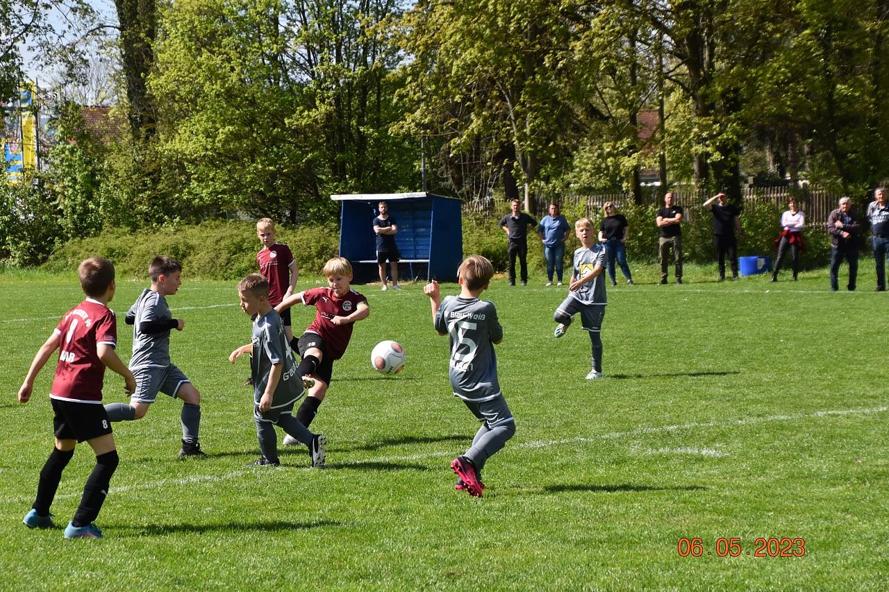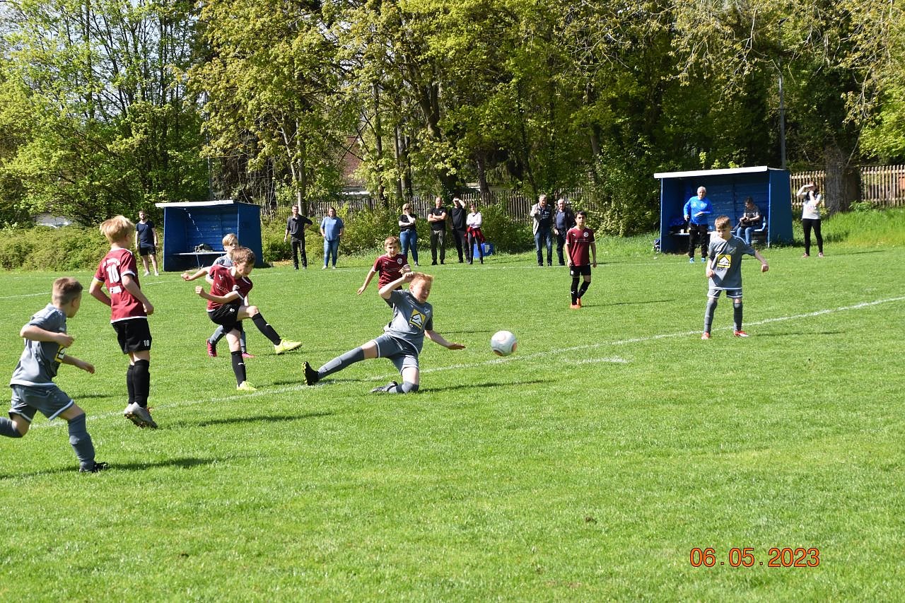 Die Wacker-Kids legten mit Anpfiff gleich los und setzten die Einheimischen unter Druck. Finn Pitulle eroberte im Mittelfeld den Ball, setzte sich bei zwei Gegenspieler durch und passte zu Nils Gold, der aus zentraler Position in der 2. Minute zur 0:1 Führung einnetzte. Eine Minute später erfolgte aus dem Mittelfeld ein Alleingang vom Kapitän Finn Pitulle, umkurvte einige Gegenspieler und setzte den Ball in die linke untere Torecke zum 0:2. In der weiteren Folge rollte Angriff auf Angriff in Richtung Greußen-Tor. Teilweise wurden die Torchancen kläglich vergeben. In der 17. Minute landete ein Fernschuss von Finn Pitulle flach im Greußentor zum 0:3. Kurz vor dem Halbzeitpfiff flog ein Torschuss von Finn noch am linken Pfosten vorbei. Aber beim nächsten Angriff setzte sich Oskar Weise am rechten Flügel durch und bediente Finn Pitulle im Strafraum, der mit seinem lupenreinen Hattrick flach in die linke Torecke den 0:4 Halbzeitstand markierte.