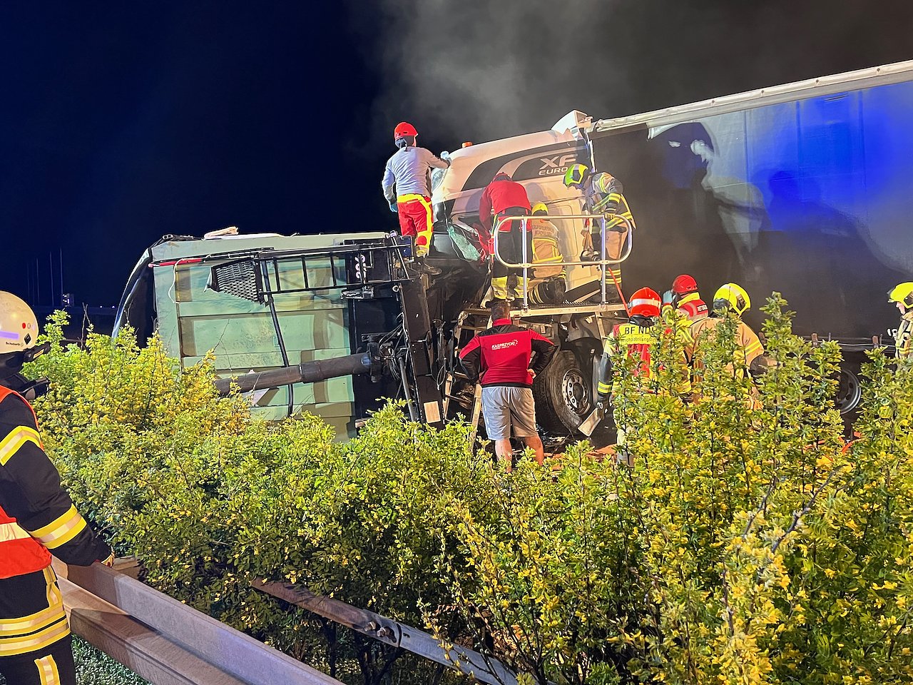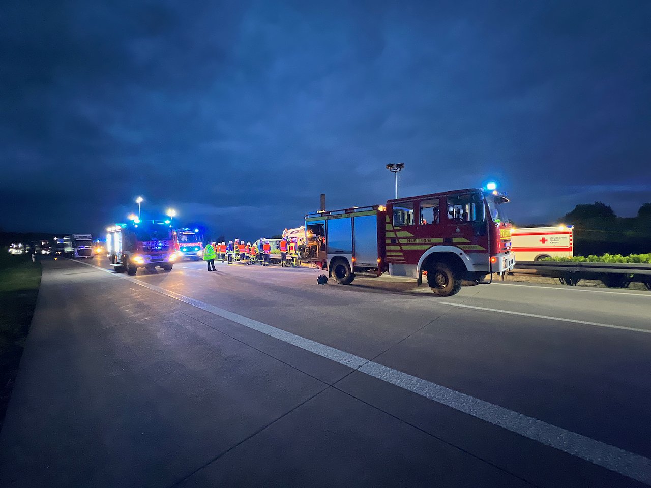 Ein dahinter fahrender 49-jähriger Pole konnte mit seinem Sattelzug nicht mehr ausweichen und fuhr in den liegenden LKW. Beide Fahrzeugführer wurden bei dem Unfall verletzt. Der Sachschaden beläuft sich nach ersten Schätzungen auf 250.000 EUR. Die Richtungsfahrbahn Göttingen ist seit dem Unfall voll gesperrt. Die Berge- und Reinigungsarbeiten werden noch mehrere Stunden andauern.