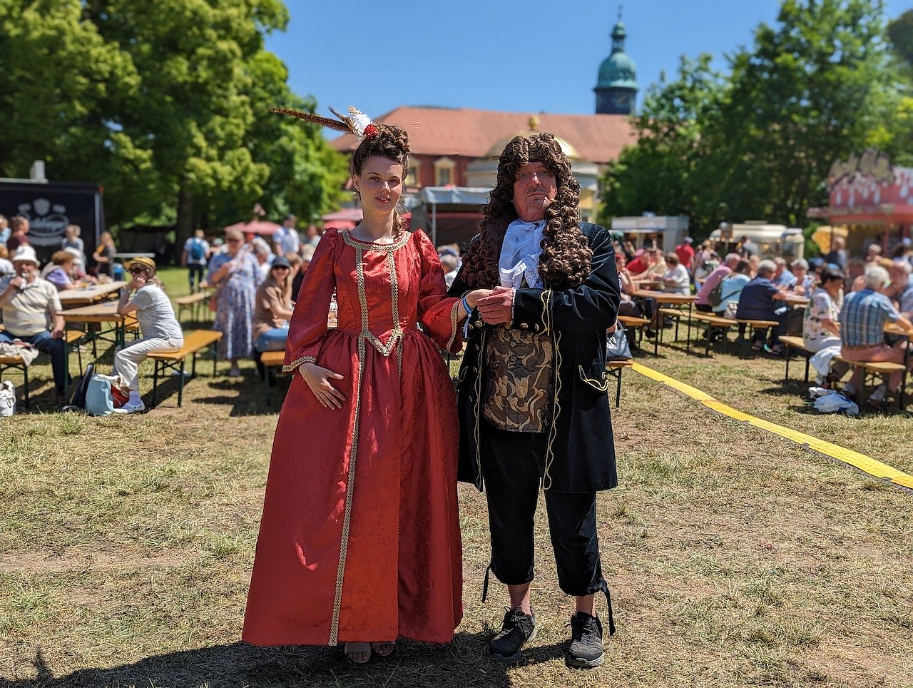 Fürstin Wilhelmine-Christiane in Person von Michelle Bose und Matthias Mitteldorf, der ihren Gemahlen Fürst Christian Wilhelm verkörperte, flanierten den ganzen Tag durch das Publikum, posierten mit Falken, probierten sich beim Bogenschießen und erfreuten die vielen großen und kleinen Besucher mit ihrer Anwesenheit und standen für Fotos zur Verfügung. Gemeinsam moderierten sie durch den Tag und kündigten die vielen Live-Acts auf der Bühne an.