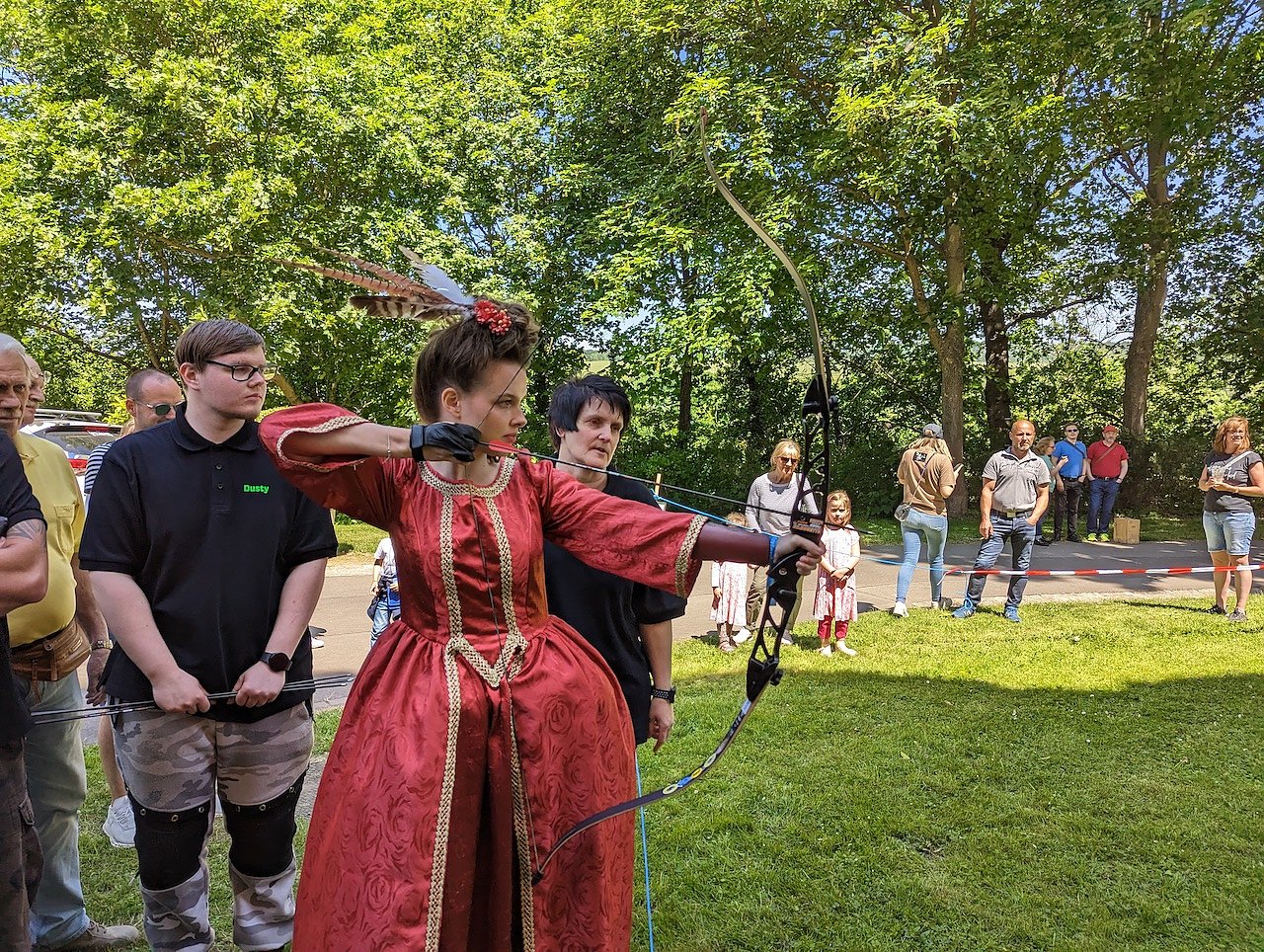 Der Bogenschießverein Schernberg zählte zu den Publikumsmagneten. Hier konnten sich nach einer kurzen Einweisung und Demonstration die Besucher selbst an Pfeil und Bogen ausprobieren. Auch die Falkner sowie Förster Ralf Hubert zogen das Publikum in ihren Bann. Die Rettungshundestaffel Teamdogs zeigten auf und vor der Bühne ihr Können beim Aufspüren eines Kindes im Publikum.