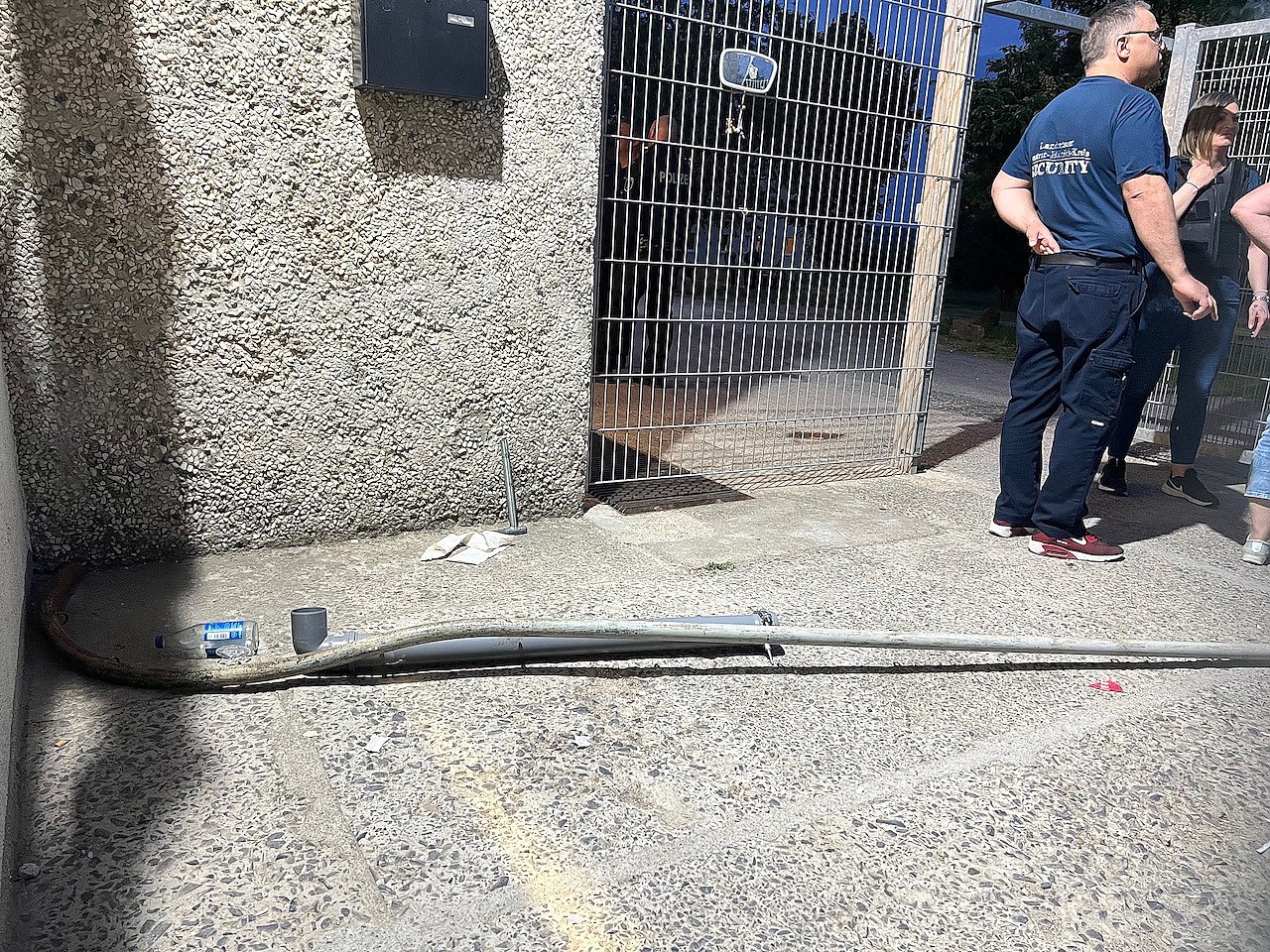Securitymitarbeiter mit Eisenstangen und Feuerlöschern bedroht