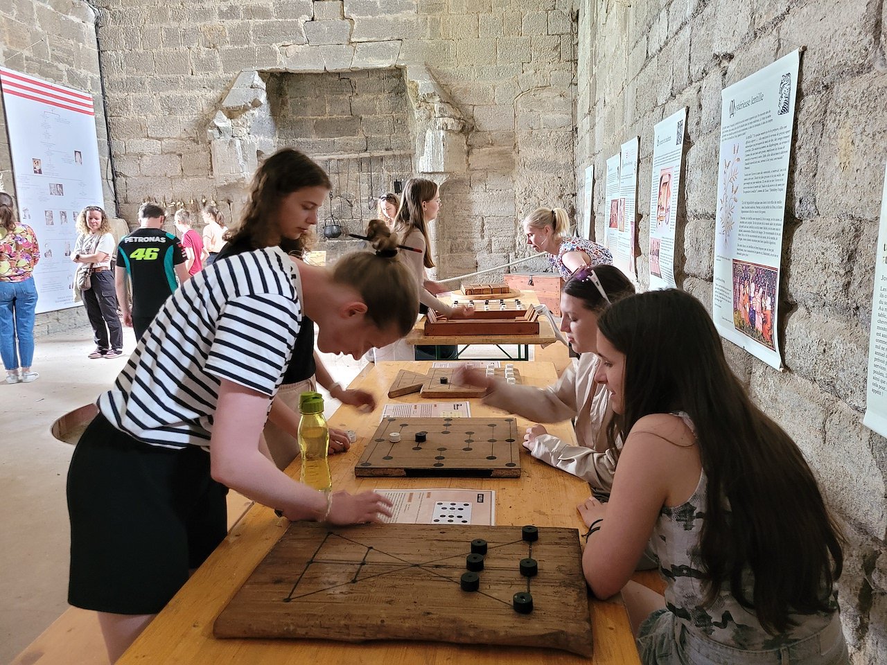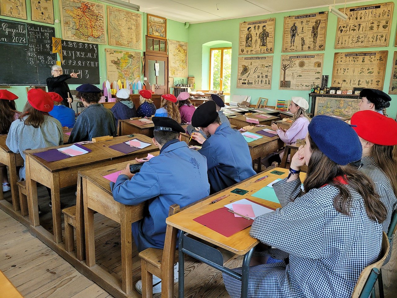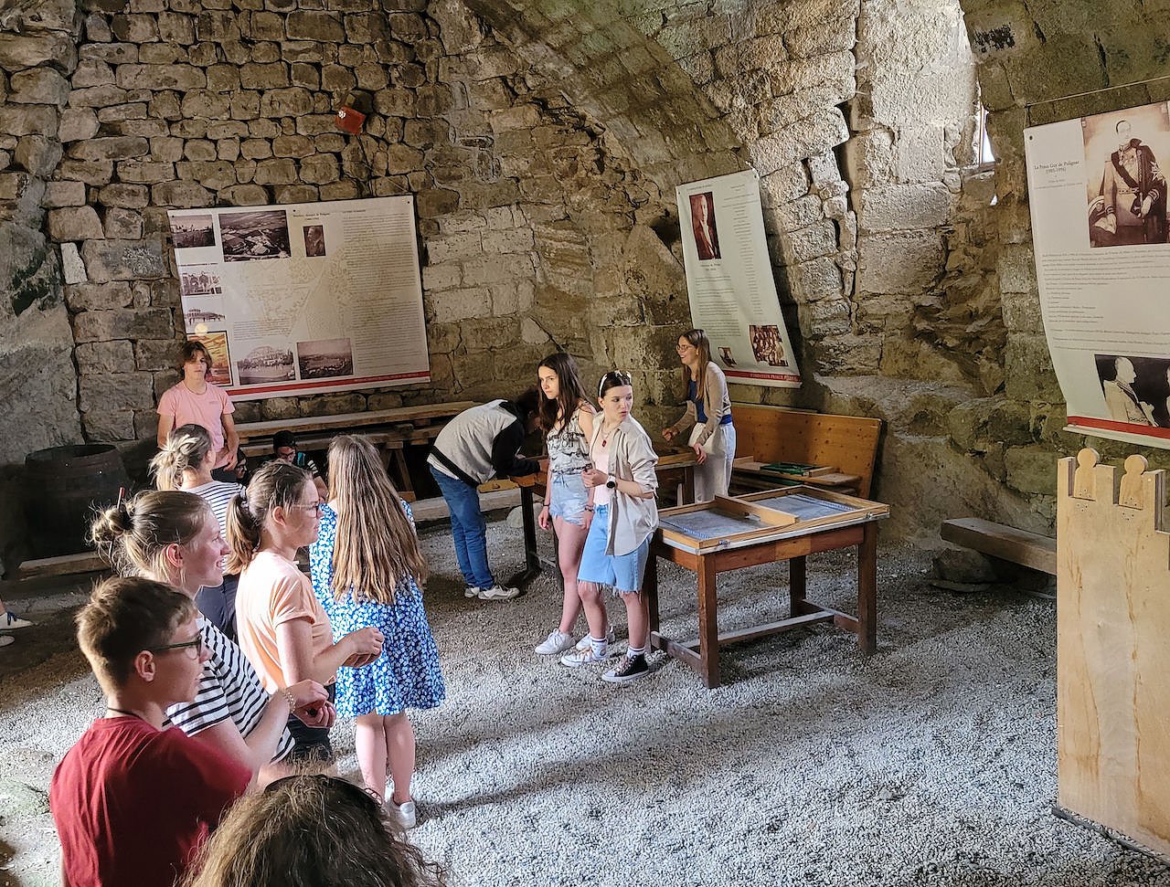 So hatten die Nordhäuser die Gelegenheit, unter fachkundiger Anleitung im Klöppelzentrum der Stadt diese alte Handwerkstechnik kennenzulernen und eine kleine, einfache Spitze (als Armband oder Lesezeichen) selbst zu klöppeln. Die Projektarbeit zum Thema Sagen und Legenden Thüringens und der Auvergne, die in Nordhausen begonnen hatte, wurde während der zweiten Austauschwoche fortgeführt. Gemeinsame Recherchen zu Legenden der Auvergne und die Zusammenstellung des Materials zu einer kleinen zweisprachige Broschüre erfolgten in der schuleigenen Bibliothek. Passend zum Projektthema führten Exkursionen in die nähere Umgebung von Le Puy, wie z.B. zur Festung von Polignac, in der unter anderem mittelalterliche Unterhaltungsspiele vorgestellt und ausprobiert werden konnten. Im kleinen Ort Le Monastier-sur-Gazeille gibt es ein interessantes Museum über Volksglauben, in dem die Jugendlichen über die Entstehung und Quellen von Legenden informiert wurden. Im Anschluss an die Führung durch das örtliche Schulmuseum, das zeigt, wie Kinder vor langer Zeit in der Schule lernten und unterrichtet wurden, bekamen die Gruppe selbst eine Stunde Unterricht im Schreiben mit Feder und Tinte.