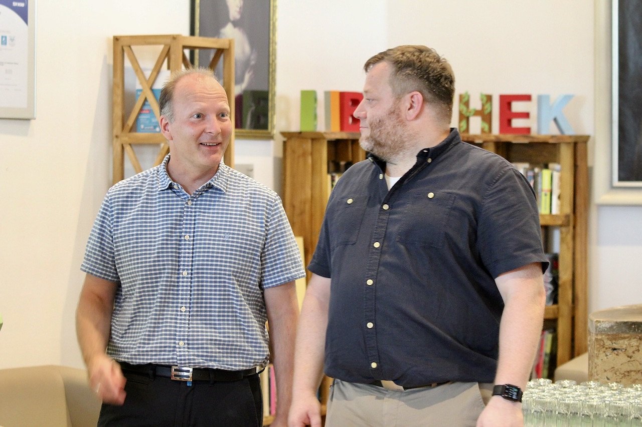 v.l. Minister Wolfgang Tiefensee und Bürgermeister der Stadt Bad Langensalza Matthias Reinz eröffneten die neu sanierten Therme symbolisch mit einer Torte (Foto: Eva Maria Wiegand)