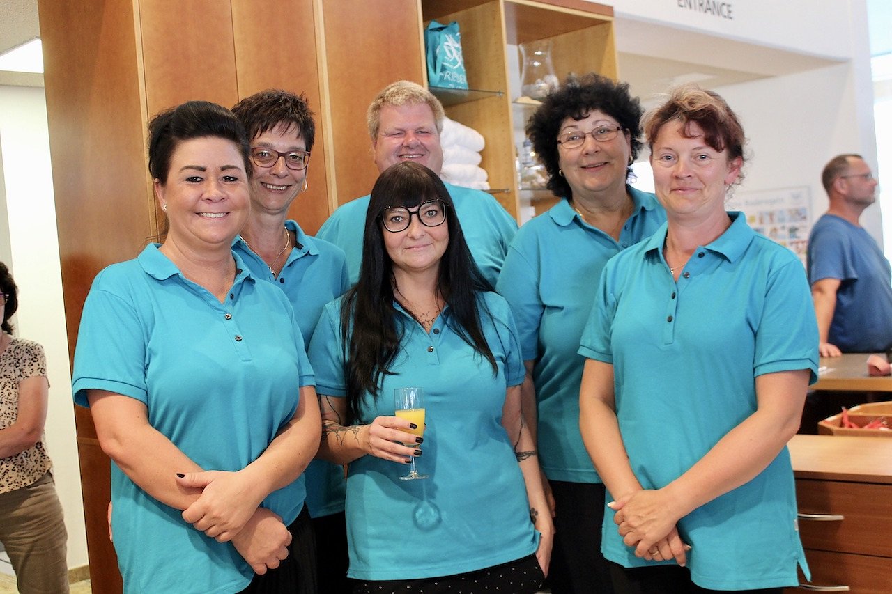 Das Team der Friederiken Therme begrüßte gut gelaunt seine Gäste bei der heutigen Neueröffnung (Foto: Eva Maria Wiegand)