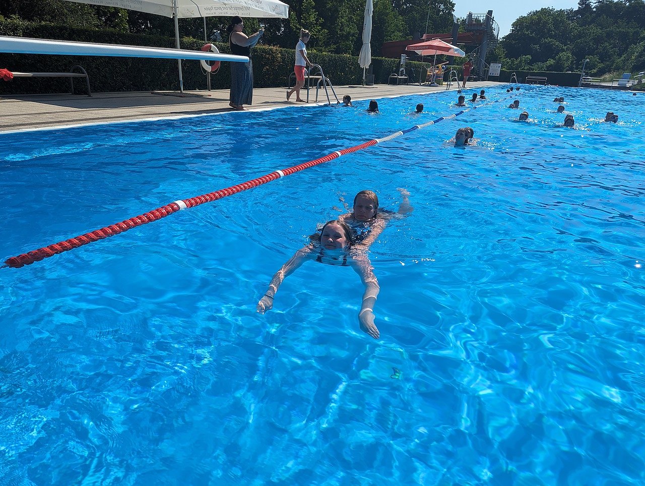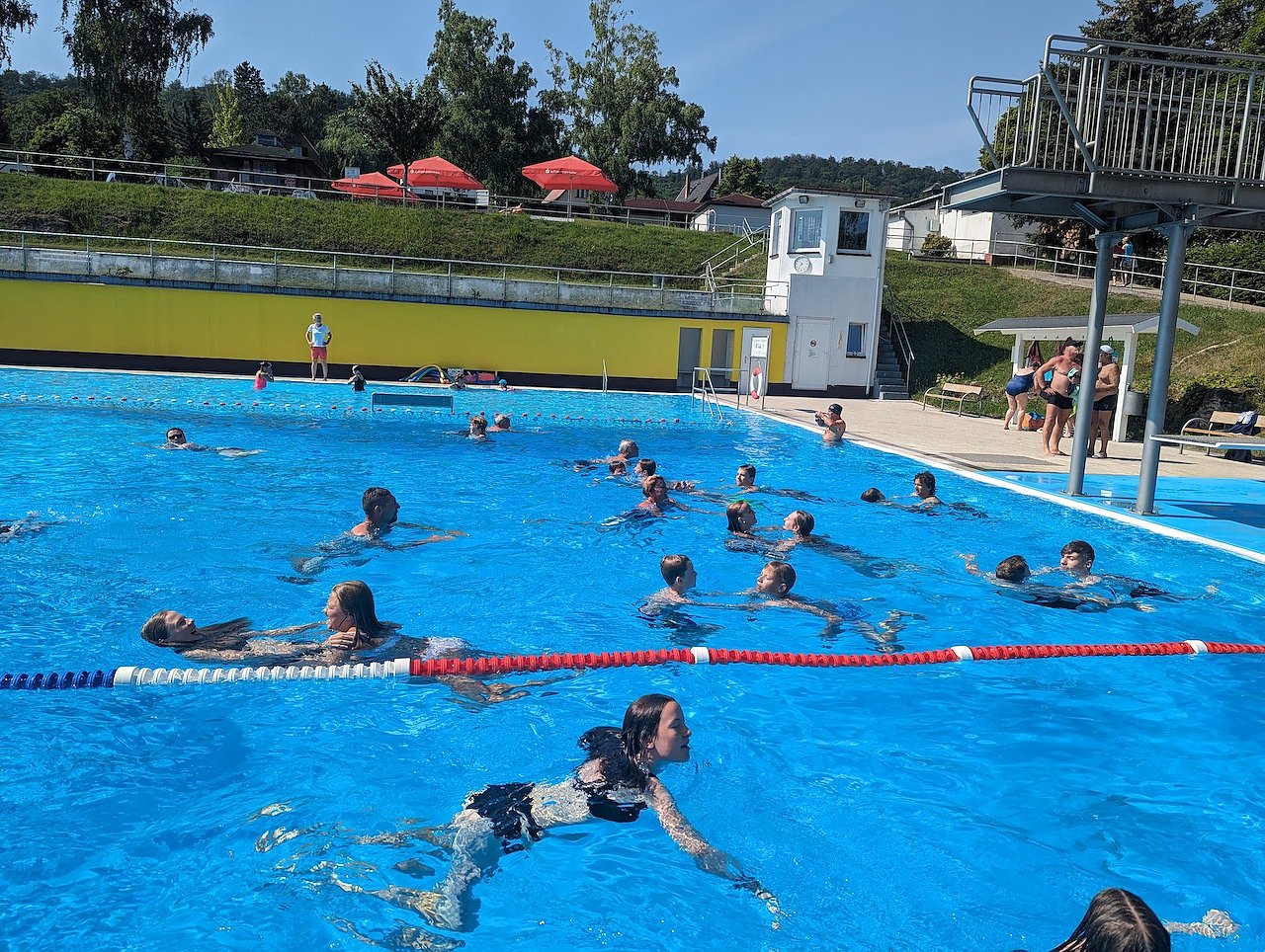 Fachliche Unterstützung kam extra aus Leipzig: ein Notfallsanitäter und eine angehende Ärztin reisten ehrenamtlich an, um die Kinder in Sachen Erste Hilfe zu unterrichten. Auch Alanis Ruppert war zur tatkräftigen Hilfe am Beckenrand dabei. Die 16-Jährige absolvierte am Morgen erfolgreich ihre letzte mündliche Prüfung bei Carolin Özbek und hat somit ihren Regelschulabschluss in der Tasche. Nur eine Stunde später stand sie mit ihr als Rettungsschwimmerin am Rand, um die Projektwoche zu begleiten.