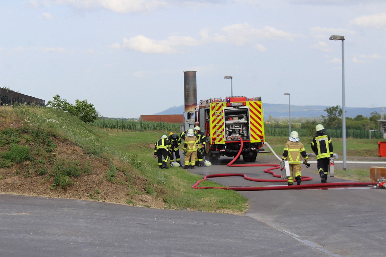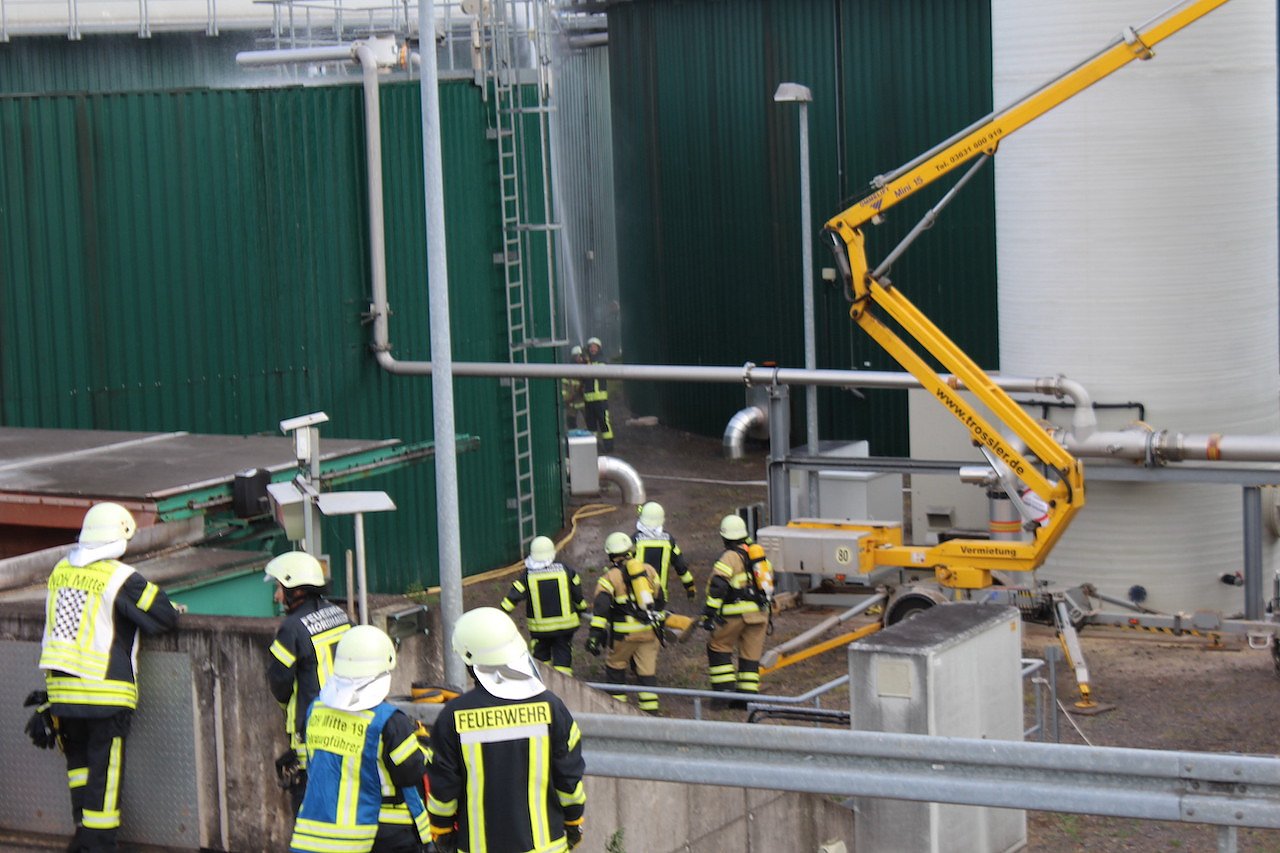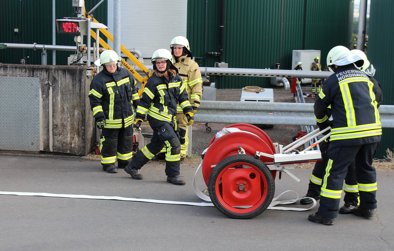 Solch reale Situationen könnten jederzeit zu einer Störung im Betrieb führen. Die EVN als Betreiber der Biogasanlage hatte in Absprache mit der Berufsfeuerwehr Nordhausen für heute Abend eine Übung organisiert, um die Abläufe für einen echten Störfall zu überprüfen. Ziel war es, das Zusammenspiel zwischen der Feuerwehr und der EVN als Betreiber der Anlage zu optimieren. Pünktlich um 18 Uhr ging der Notruf in die Leitstelle der EVN, von dort in die Rettungsleitstelle und von da zu den einzelnen Wehren. Knapp zehn Minuten später waren die ersten Kameraden vor Ort.