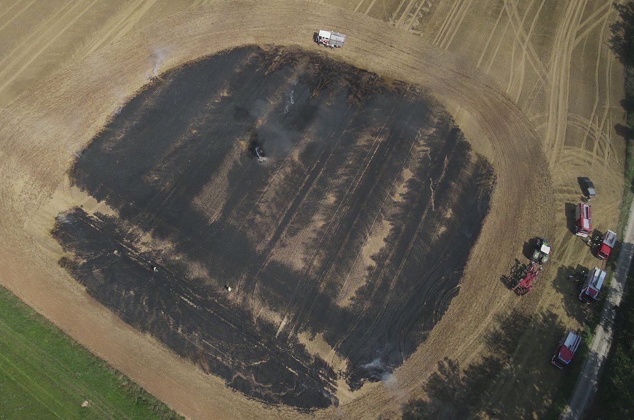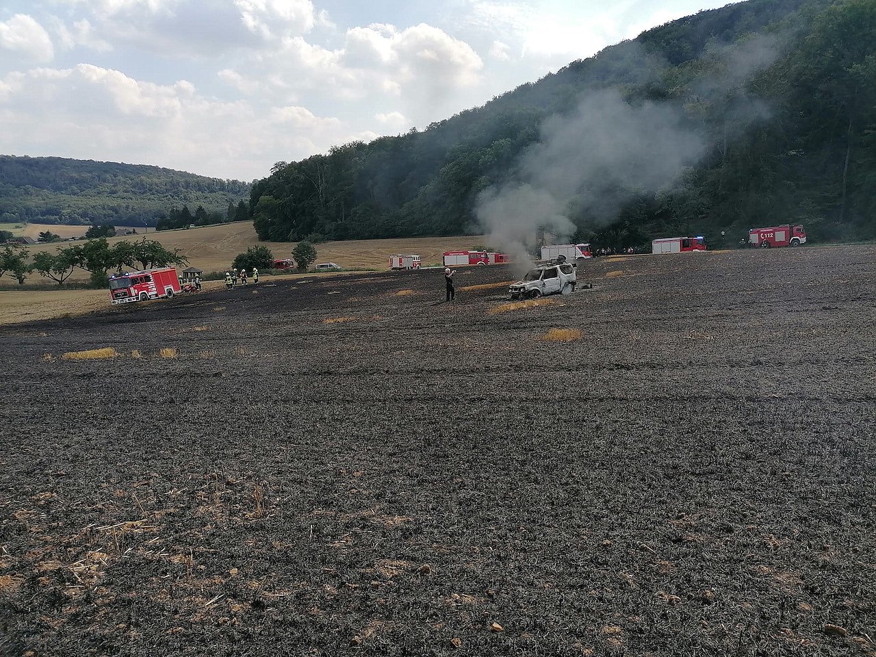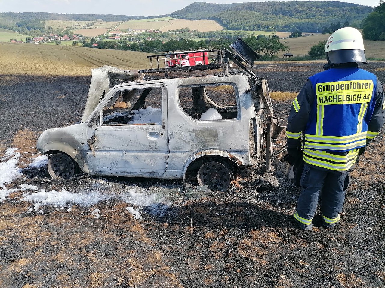 Dazu stand er mit seinem Fahrzeug auf dem Feld. Nach ersten Erkenntnissen geriet nach einem technischen Defekt der PKW in Brand. Die Flammen griffen dann auf das Stoppelfeld über.