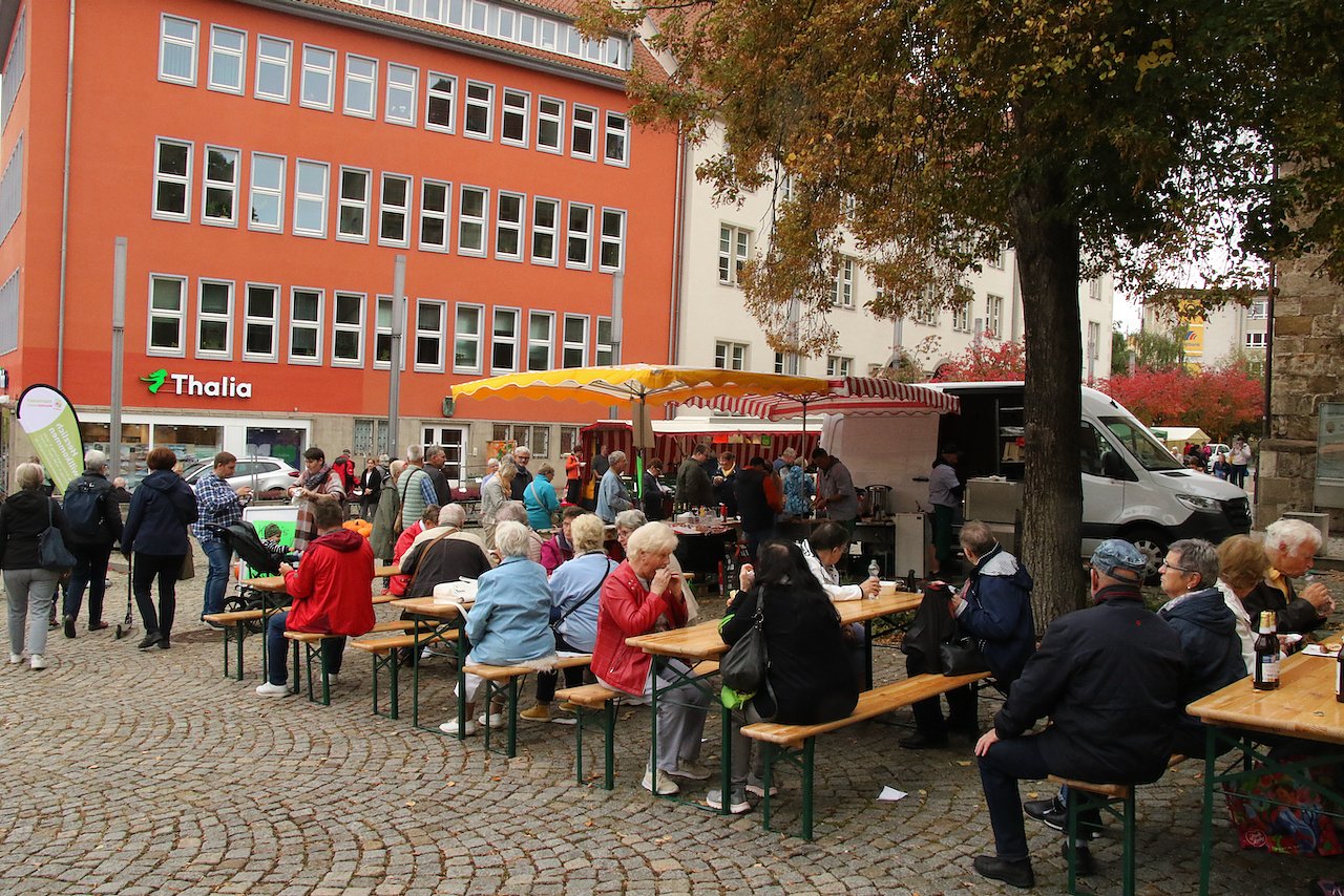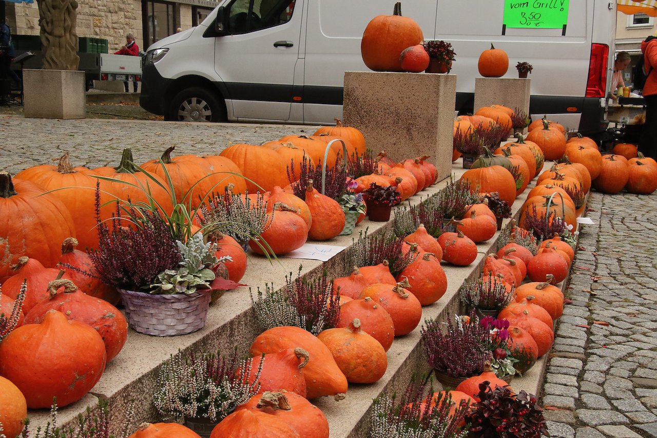Kürbisse, Kürbisse und noch einmal Kürbisse aber auch Wurst, Blumen, Gemüse, Honig und Handwerkskunst bestimmten heute das Bild auf dem Rathausplatz. Bei Live-Musik und warmer Kürbisssuppe konnte man schlendern und einkaufen. Für Halloween Freunde gab es außerdem die Möglichkeit, dem Kürbis mit dem Messer zu Leibe zu rücken.