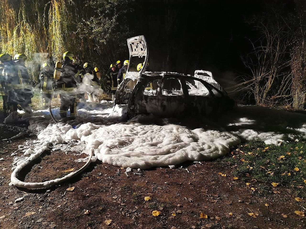 Anwohner hatten gegen 22.35 Uhr mehrere Knallgeräusche wahrgenommen. Beim Nachschauen entdeckten sie vor ihrem Grundstück einen brennenden PKW. Daraufhin wurden die Einsatzkräfte alarmiert. Beim Eintreffen der Feuerwehr stand der PKW bereits im Vollbrand.