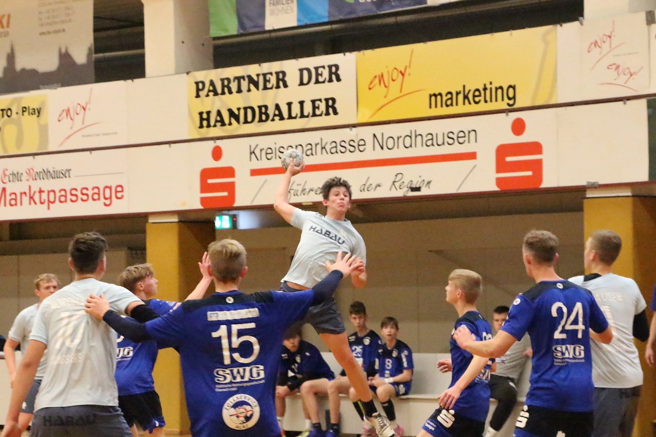 Nordhausen hatte einen Start nach Maß, führte nach fünf Minuten mit 4:1. Viermal wurde Jeremy Helbing wunderbar auf Linksaußen freigespielt. Nach weiteren fünf Minuten lagen die Nordhäuser Jungs sogar mit 7:3 in Front. Erst jetzt fanden die Gäste von der Wartburg langsam ins Spiel. Begünstigt durch nun einige Fehler zu viel der Hausherren schafften sie den Ausgleich zum 9:9 (18.). Doch Nordhausen legte wieder vor, nahm schließlich eine knappe 13:12-Pausenführung mit in die Kabine.