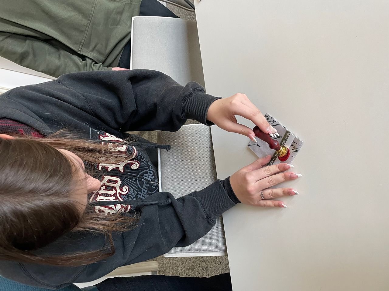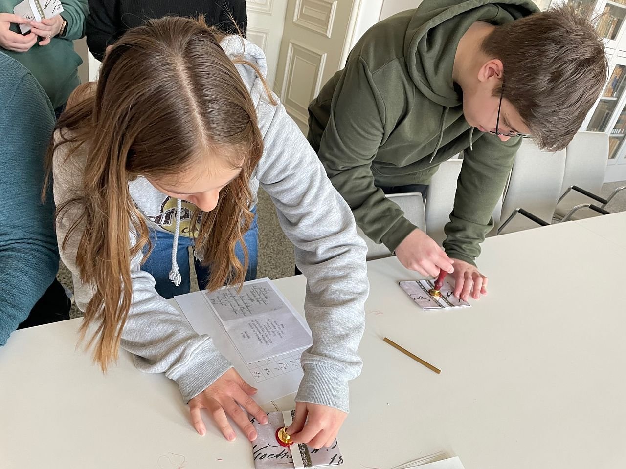 Kinderbriefe, Glückwünsche, Urkunden, Notizen, Mitteilungen an Goethe und originale Zeichnungen wurden mit Hilfe der bis Mitte des 20. Jahrhunderts gängigen Verkehrsschrift im deutschsprachigen Gebiet entschlüsselt. Dazu wendeten sich die Gymnasiasten dem Alphabet der Kurrentschrift zu, lasen die Texte und fertigten selbst Neujahrsgrüße an. Das entstandene Schmuckblatt wurde entsprechend historischer Vorgaben gefaltet und das Schriftpaket abschließend mit Wachs versiegelt. Anhand verschiedener Siegel Die praktische Arbeit bereitete viel Freude In dem Workshop lernten die Schülerinnen und Schüler die Briefkultur sowie das Briefzerimoniell des 18. und 19. Jahrhunderts kennen.