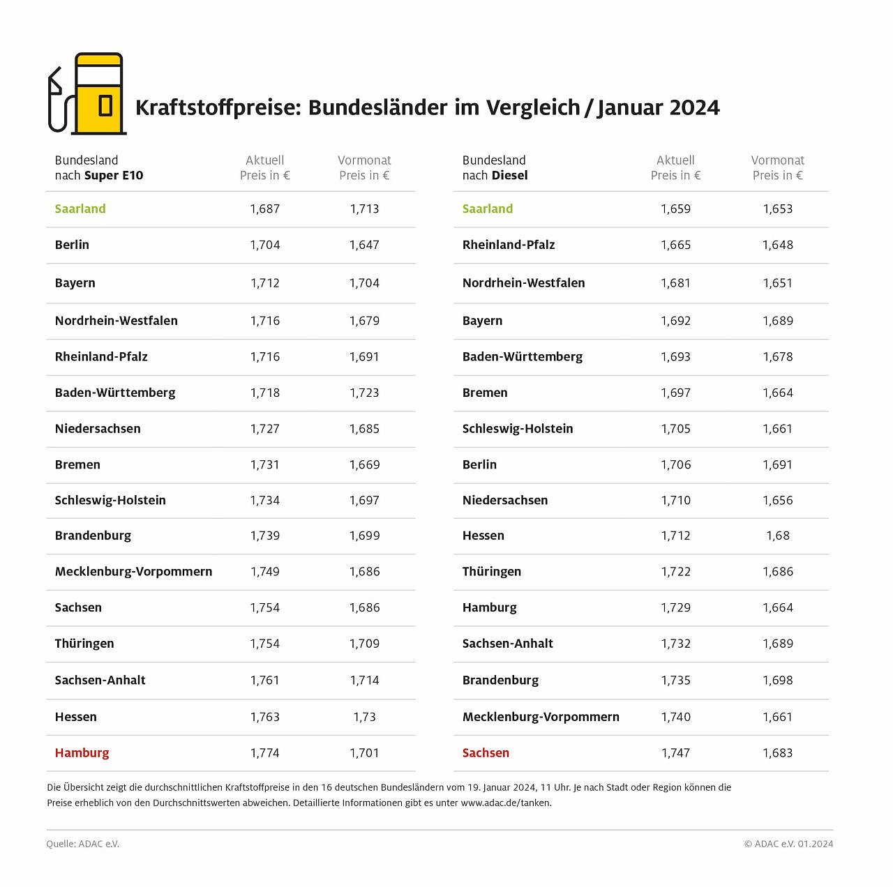 Dies zeigt die aktuelle ADAC Auswertung der Kraftstoffpreise in den 16 Bundesländern. Teuerste Bundesländer sind für die Fahrer von Benzinern Hamburg und Hessen, für Dieselfahrer Sachsen und Mecklenburg-Vorpommern. Am preiswertesten sind beide Kraftstoffe im Saarland.