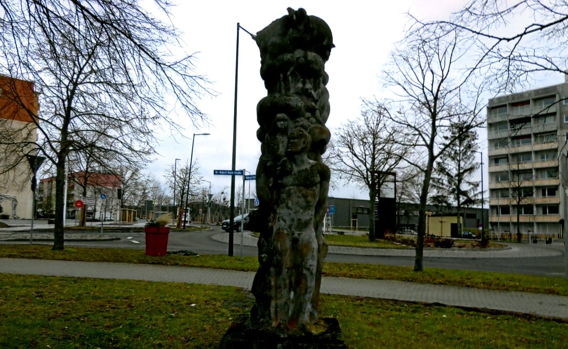 Auf einer quadratischen Platte hat der Künstler in der Mitte um einen Baum herum eine Familie gruppiert, Mutter, Vater und drei Kinder unterschiedlichen Alters, einen Hund, die Irish-Setter-Hündin Anja der Familie Rechtacek, ein Katzenpaar, ein Taubenpaar und auf dem Wipfel des Baumes gruppieren sich mehrere Vögel. Dieses Kunstwerk ist ca. 3 m hoch und besitzt einen Umfang von 1,5 m. Schaut man die Skulptur an, so ist man doch traurig, dass viele Einzelheiten der detailreichen Gestaltung im Laufe der Jahre nicht mehr die Möglichkeit haben, eindeutig für sich zu wirken. Moose haben sich angesiedelt, Schmutzpartikel der nahen Stolberger Straße sich daraufgelegt. Errichtet man ein Denkmal, so ist der Besitzer in der Pflicht der Pflege, den Bewohnern gegenüber, dem Künstler und dem Kunstwerk.
