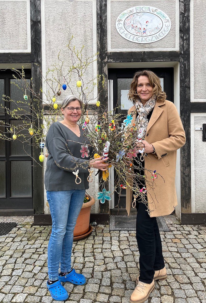 Jana Zöller übergibt den Kindern der Kita Kleine Spürnasen und Kita-Leiterin Liana Bauer im Beisein von Bürgermeistern Alexandra Rieger 112 Schoko- Osterhasen (Foto: Katrin Bergmann)